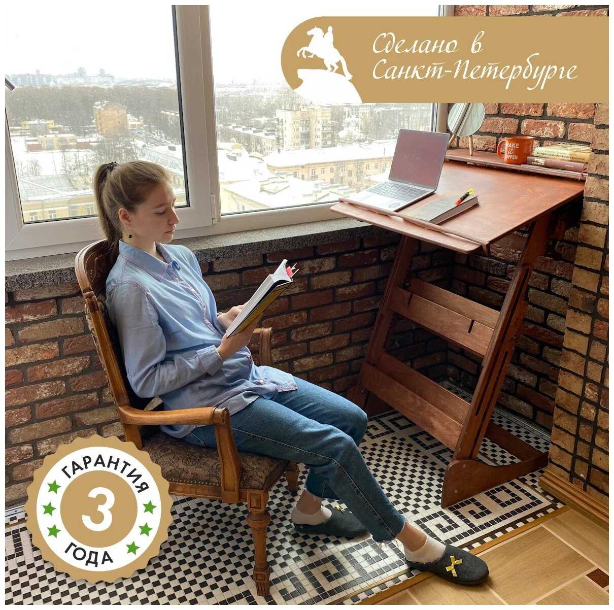 Я также использую стол в офисе и как замену планшета для живописи. Удобная и быстрая регулировка угла столешницы дает возможность использовать стол в моей мастерской для разных целей. Угол столешницы менять легко. Столешницу можно поднимать и опускать. Правда к этому надо приноровиться – бывает тяжеловато поднимать стол. Очень удобно было учиться за конторкой в университете онлайн– угол наклона столешницы помогал снять нагрузку со спины во время долгой учебы. Ноутбук находился на подставке из Икеи – таким образом он не сползал.