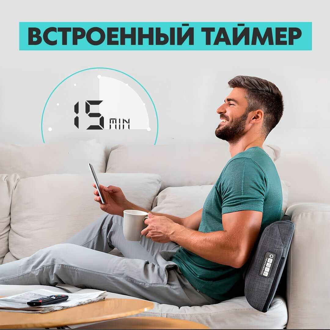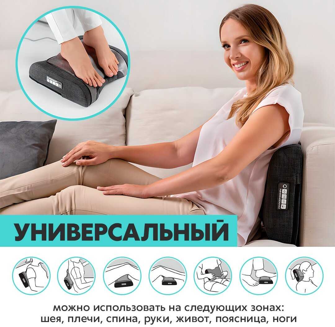 Возможность использования массажной подушку на выбранную зону: воротниковую, руки, живот, плечи, нижняя или верхняя часть спины, ноги, ступни.