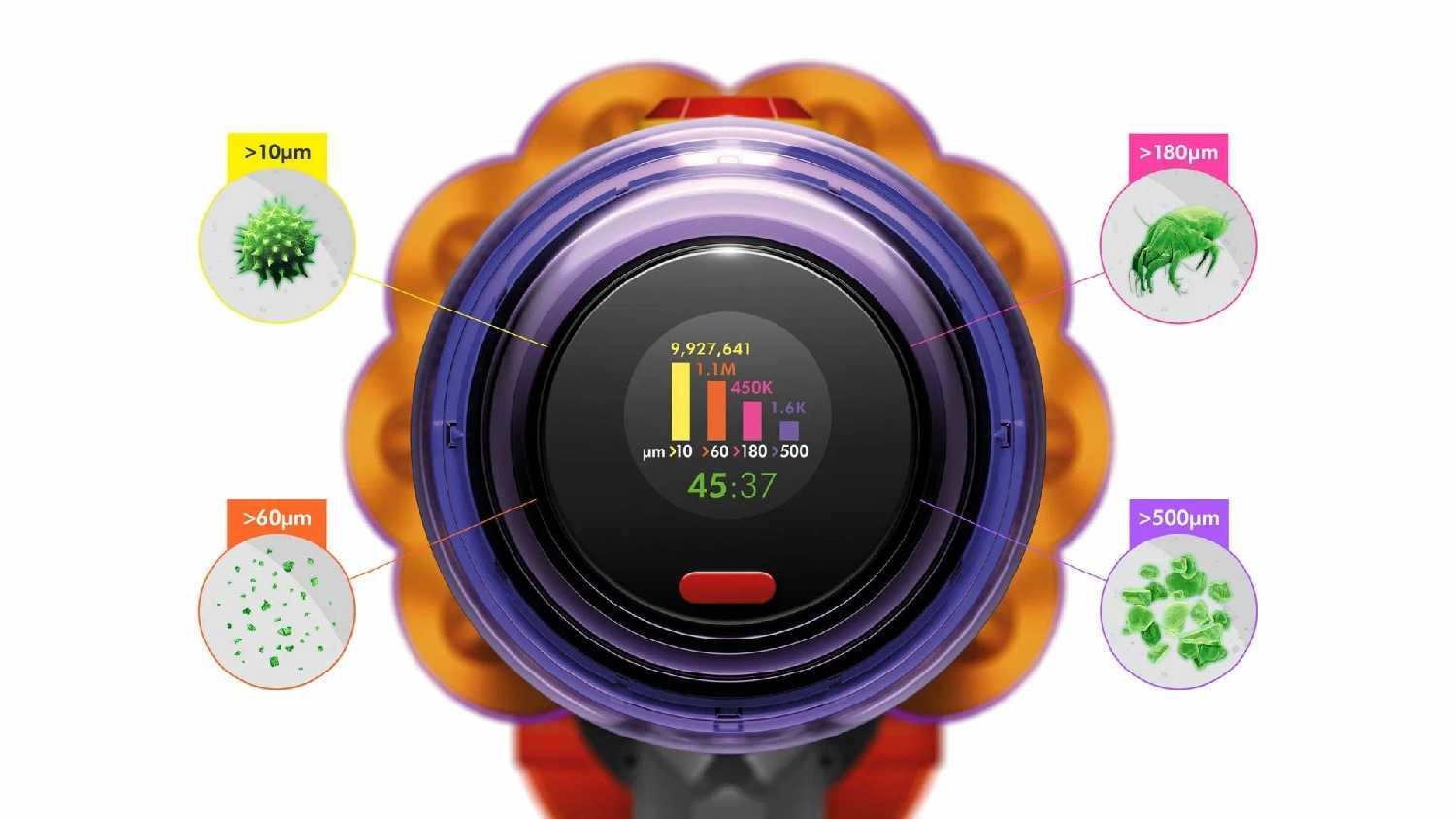 - Дисплей отображает оставшееся время работы, размер частиц пыли и подсказки по обслуживанию (например, промывке фильтра).