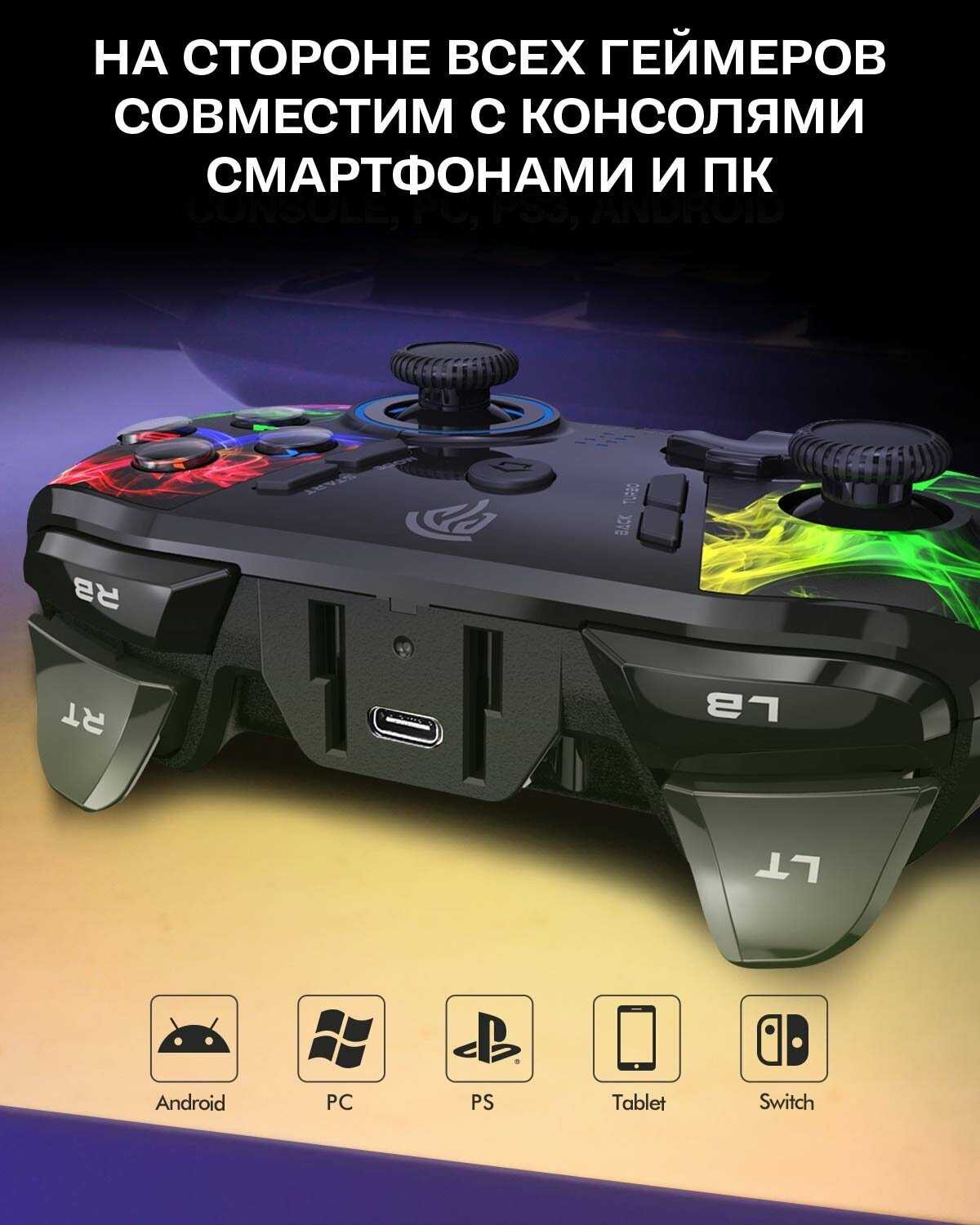Функциональность и дополнительные опции: Наличие программируемых кнопок на тыльной стороне геймпада расценивается как серьезное функциональное преимущество, особенно в файтингах и шутерах, где они позволяют выносить сложные комбинации и уменьшают количество необходимых телодвижений. Многоуровневая регулируемая подсветка не только выполняет декоративную функцию, но и оказывается практичной при использовании в условиях слабого освещения. Важной особенностью является кроссплатформенность: устройство стабильно работает с ПК, Smart-TV и мобильными устройствами при проводном подключении, что расширяет его сферу применения. Однако некоторые пользователи отмечают, что кнопки Turbo и Back расположены не совсем удобно, так как при быстром доступе к ним палец может задевать основание левого стика, что требует периода привыкания для избежания случайных нажатий.