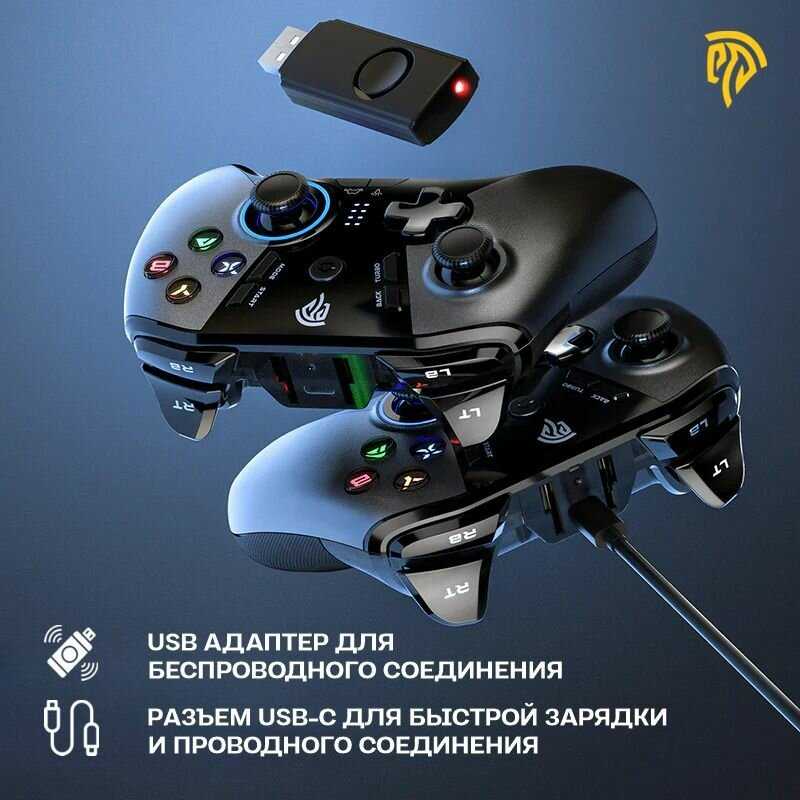 Геймпад легко подключается к ПК через беспроводной приемник (донгл), который распознается системой автоматически, без необходимости установки дополнительных драйверов. Для подключения к телевизору или телефону используется кабель Type-C, входящий в комплект. Беспроводное соединение через ресивер отличается стабильностью и мгновенным откликом, что подтверждается множеством пользователей. -