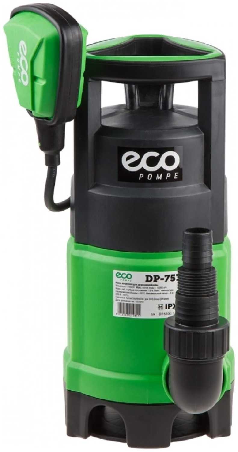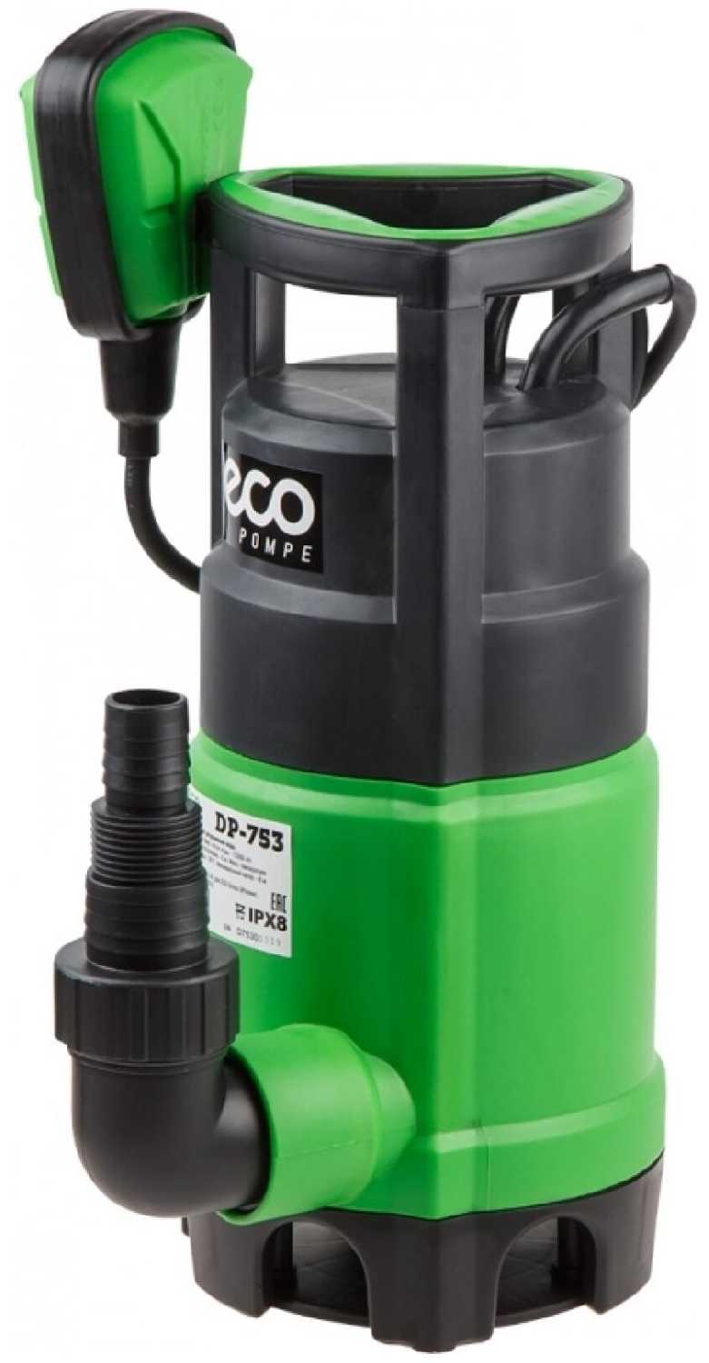 Подробная комплектация : | Погружной насос дренажный ECO DP-753 750 Вт 13000 л/ч 9 м, универсальный патрубок с угловым коленом. |