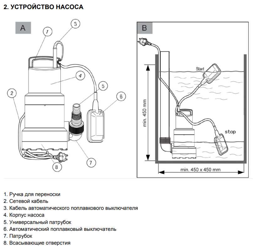 Функции : | защита от перегрева, защита от сухого хода, поплавковый выключатель |