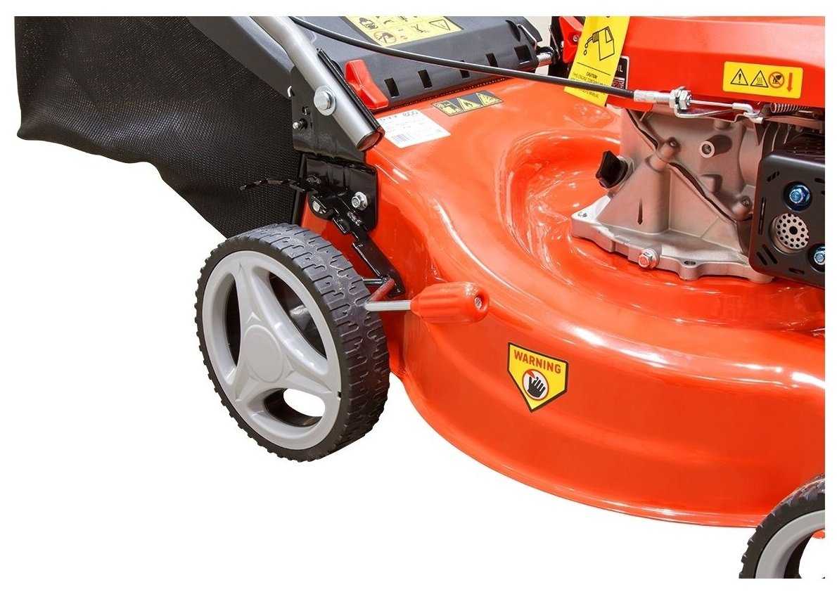 - Механизм подъема-опускания с несколькими позициями адаптируется к разным уровням травы, позволяя поддерживать газон на желаемой высоте без дополнительных инструментов.