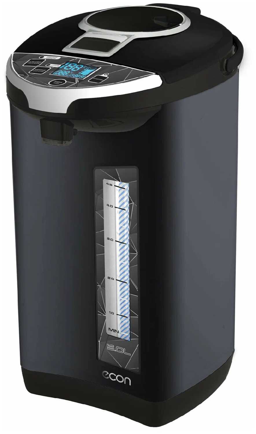 Полный нагрев 5 литров воды из-под крана до кипения занимает около 40 минут. Для меньшего объема, например 1 литра, время сокращается до 5-10 минут. Пользователи подчеркивают, что термопот не предназначен для быстрого кипячения как обычный чайник, а больше для поддержания готового кипятка. После нагрева он хорошо держит температуру, подогревая при необходимости. Это удобно для семьи, но требует планирования. -