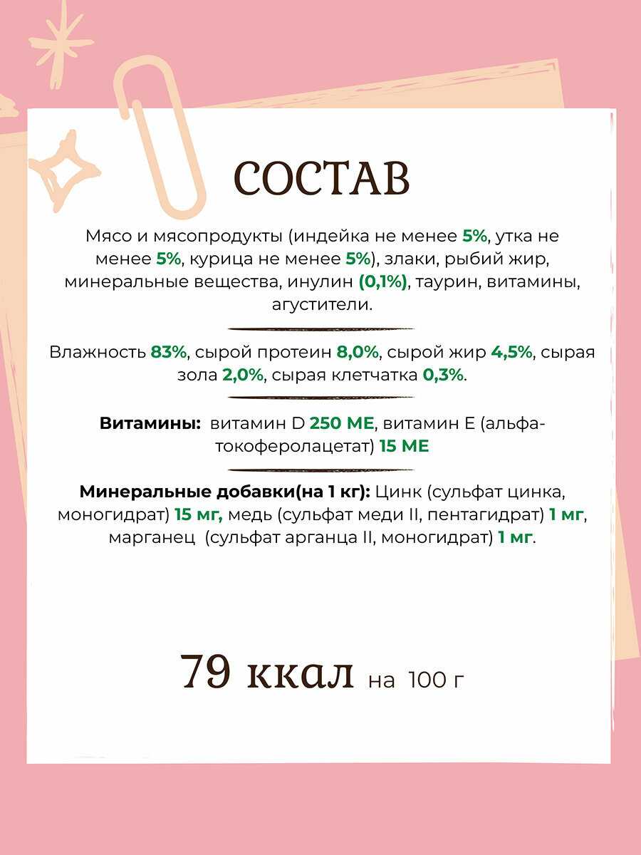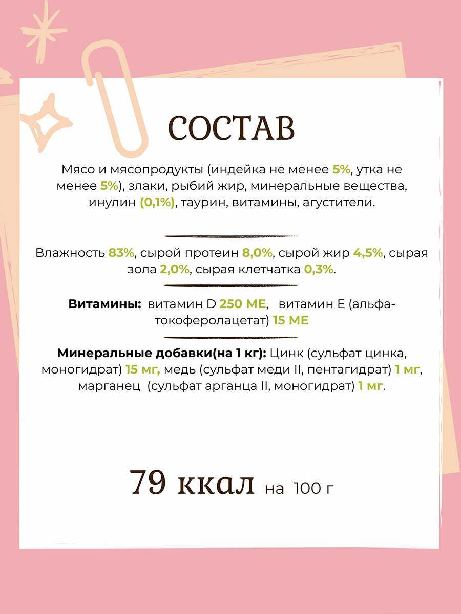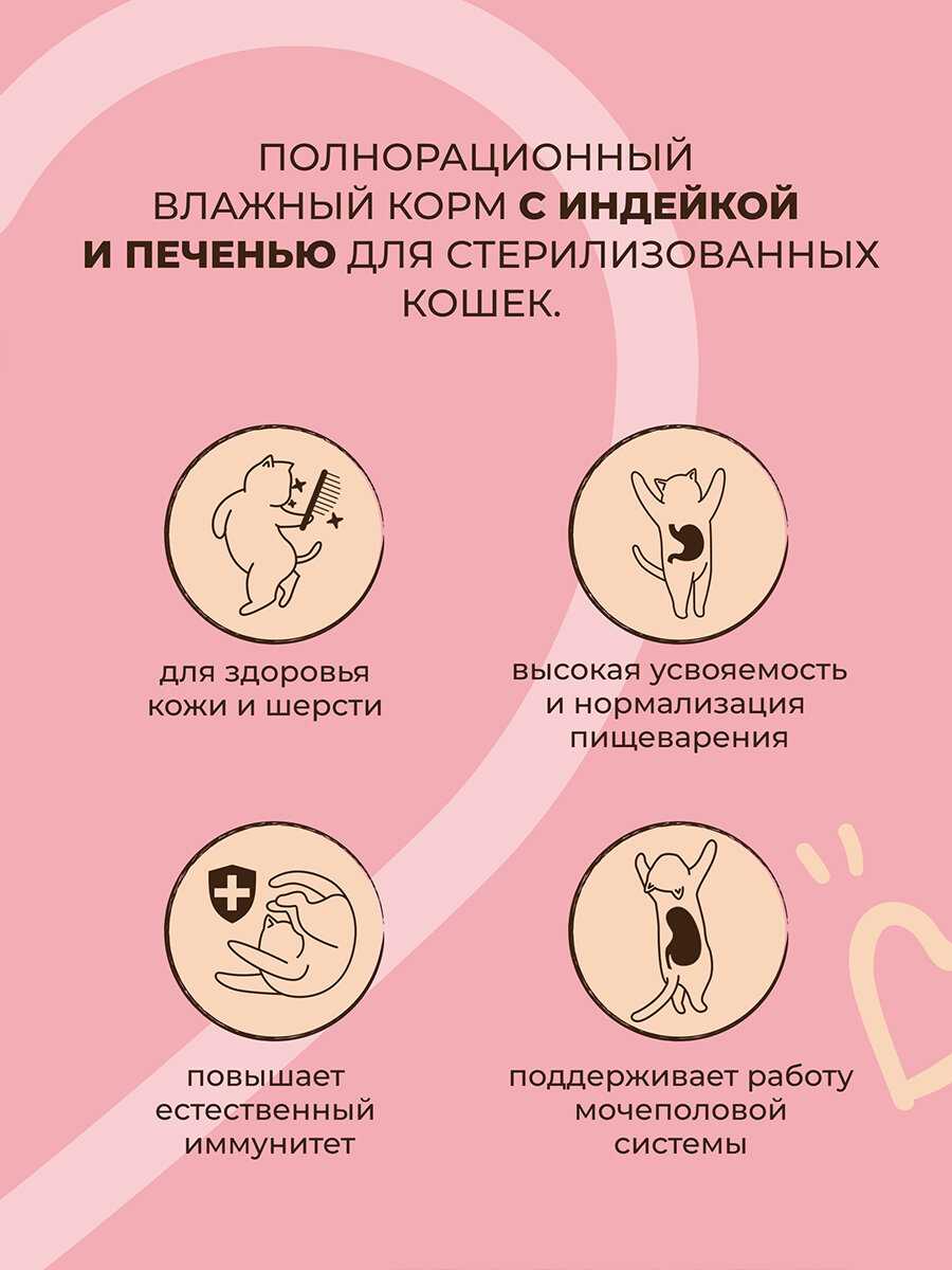 - + Достойный по цене и качеству корм. Кот в охотку его кушает. В линейки 4 вида вкуса, поэтому коту нравиться когда меняем и он не привыкает к одному. Банка 400гр хватает на 2-3 дня.