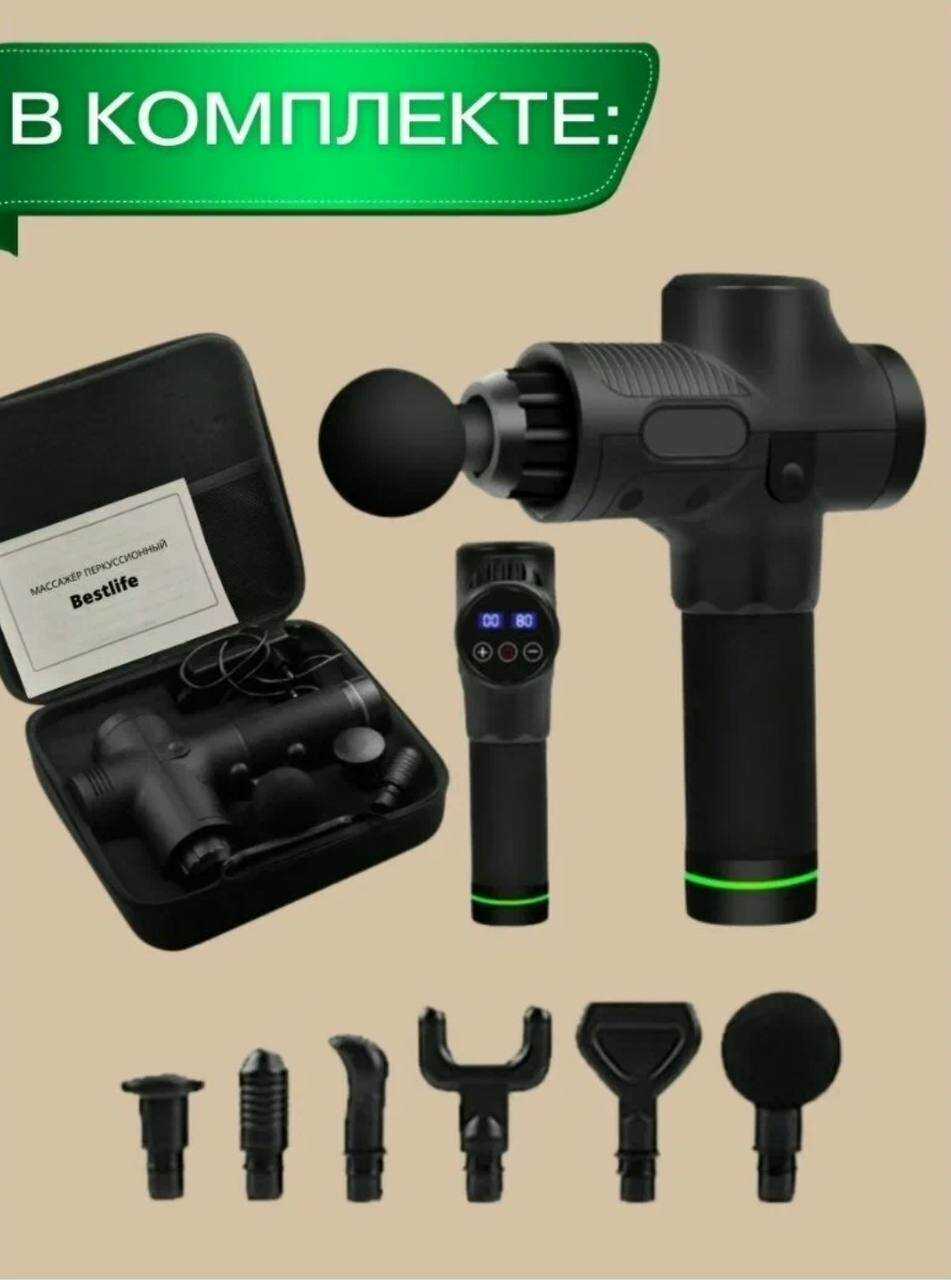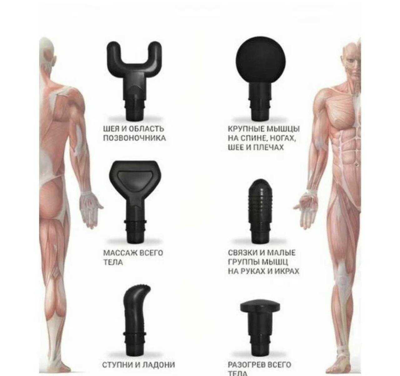 | Подробная комплектация : | Перкуссионный массажный ударный пистолет с 6-ю различными насадками и блоком питания для зарядки. |