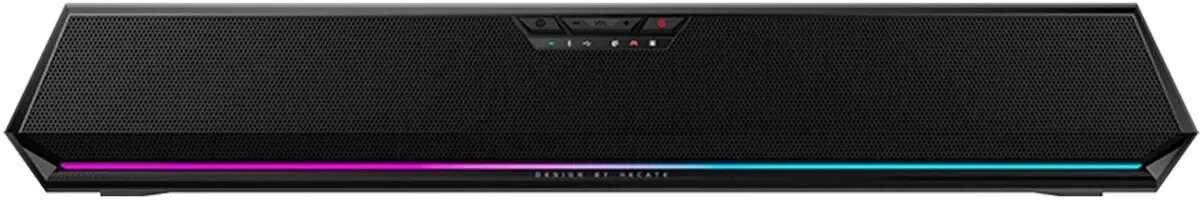 Саундбар имеет вытянутую форму и небольшие габариты, что позволяет удобно разместить его под монитором или по бокам от него на стандартном компьютерном столе. Он не занимает много места и органично вписывается в игровой или рабочий setup благодаря своему дизайну. Малые размеры делают его также удобным для использования с ноутбуком или на кухне. -