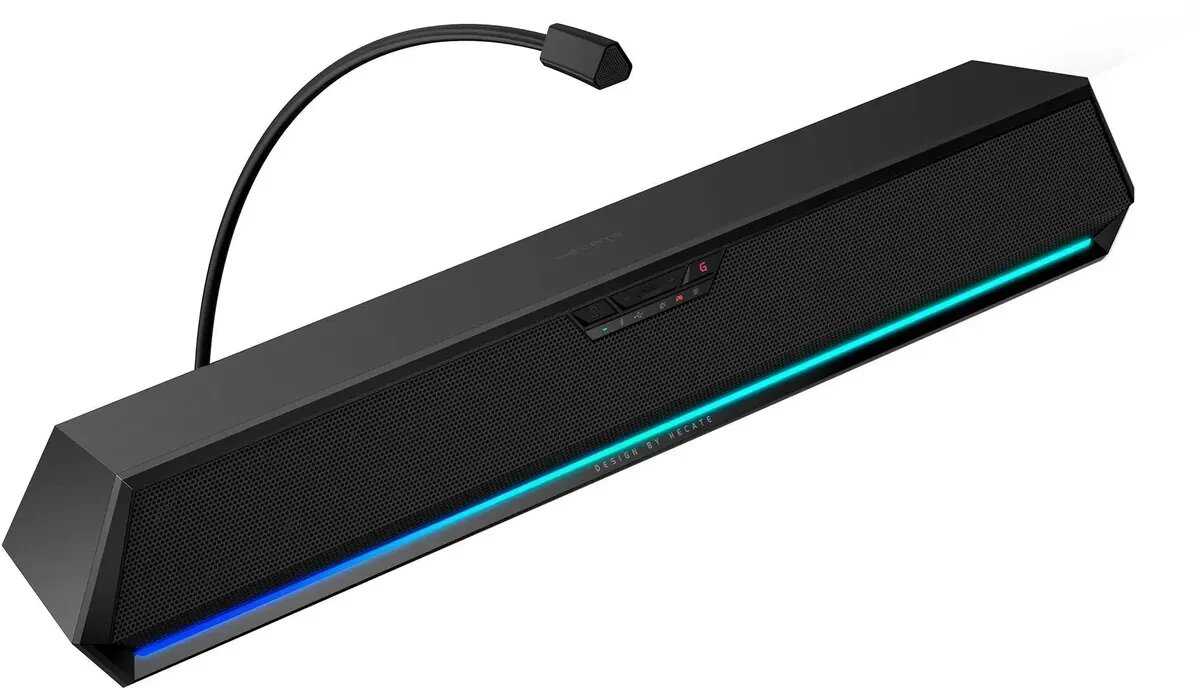 Саундбар имеет вытянутую форму и небольшие габариты, что позволяет удобно разместить его под монитором или по бокам от него на стандартном компьютерном столе. Он не занимает много места и органично вписывается в игровой или рабочий setup благодаря своему дизайну. Малые размеры делают его также удобным для использования с ноутбуком или на кухне. -
