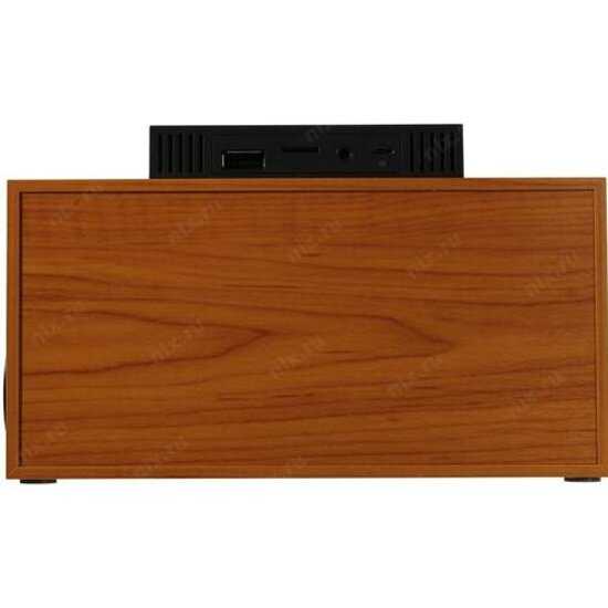 - Колонка выглядит меньше на фото, вписывается в интерьер кухни, спальни или рабочего стола благодаря ретро-стилю, МДФ-корпусу и светлым тонам.