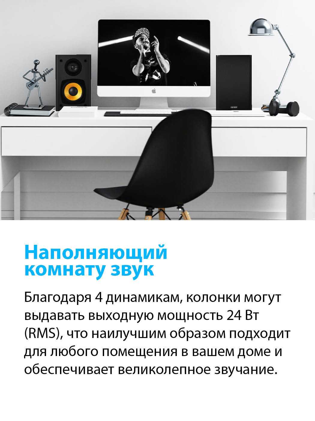 | Дополнительная информация : | активная АС с общей выходной мощностью 24 Вт, усилитель класса D, регулировка уровня громкости и баса |