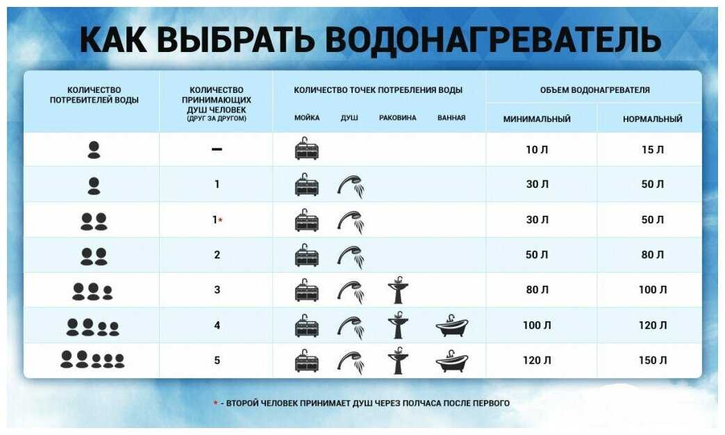- Оптимальный объём бака (80 литров) для семьи из 3–5 человек: