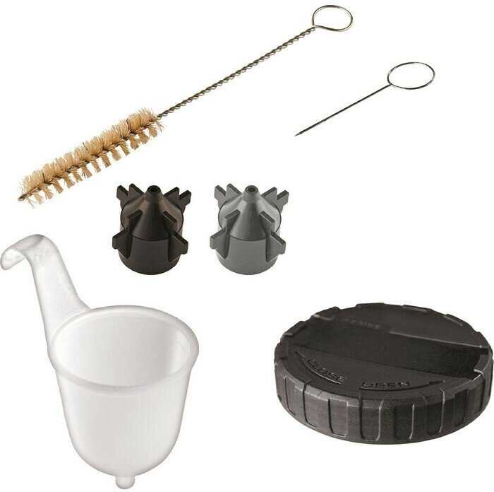 Комплектация : | Краскопульт, 2 распыляющие насадки: 2.5 и 3 мм, Щетка и игла для прочистки, Резервуар для пробы вязкости, Резервуар с крышкой для краски 800 мл, Упаковка. |