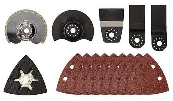 | Комплектация : | треугольная шлифовальная подошва, девять листов абразивной бумаги (3*P60/3*P80/3*P120), шабер, пильные насадки для дерева и пластика (HCS) и для металла (BIM), пильный сегмент для дерева пластика или мягкого металла (HSS), твердосплавная насадка для кафельной плитки |