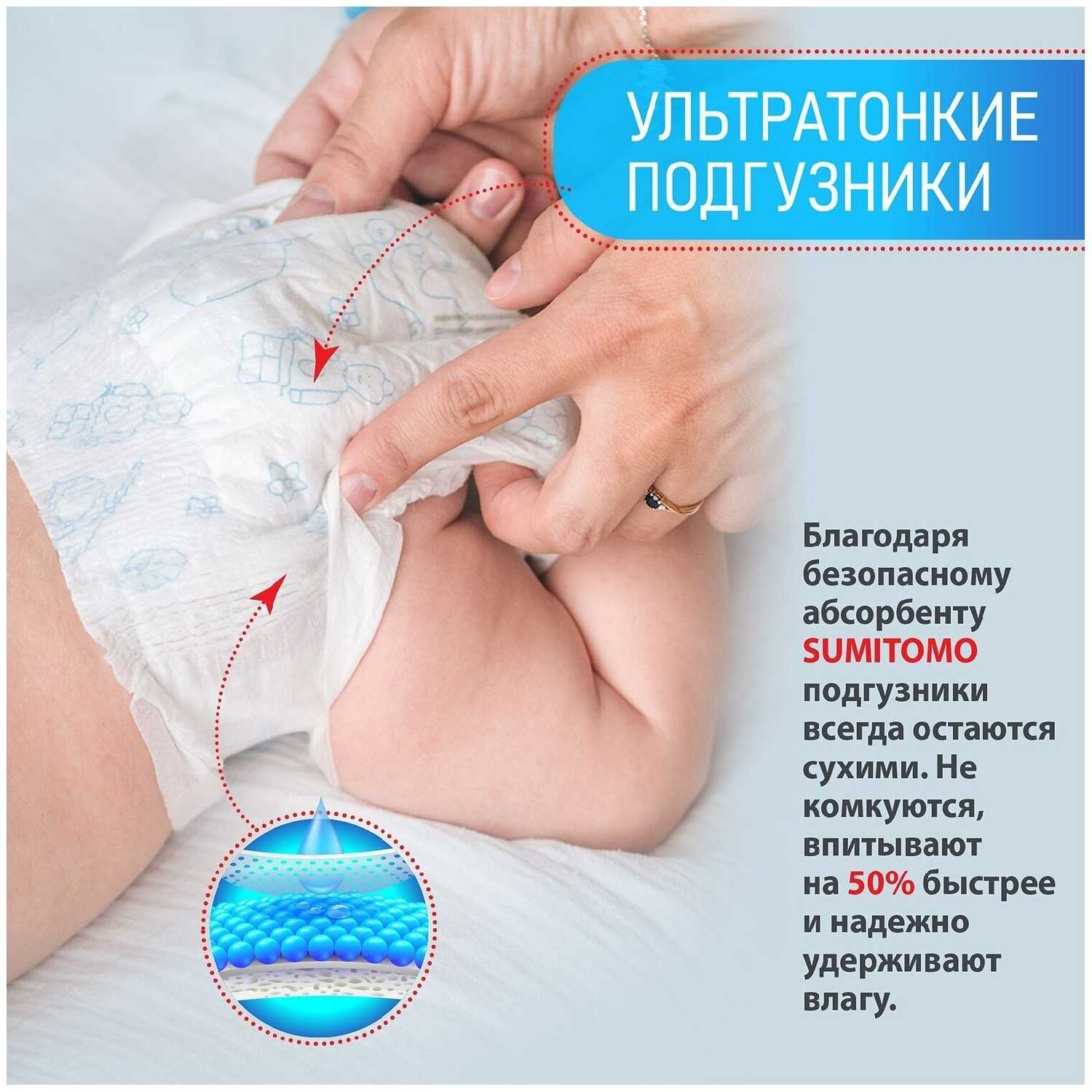 Подгузники удерживают 2-3 мочеиспускания без протеканий, что подтверждается тестами пользователей. При полном наполнении возможна лёгкая влажность на поверхности, но критичных протечек не зафиксировано. Резинка на спинке эффективно блокирует выход жидкого стула.