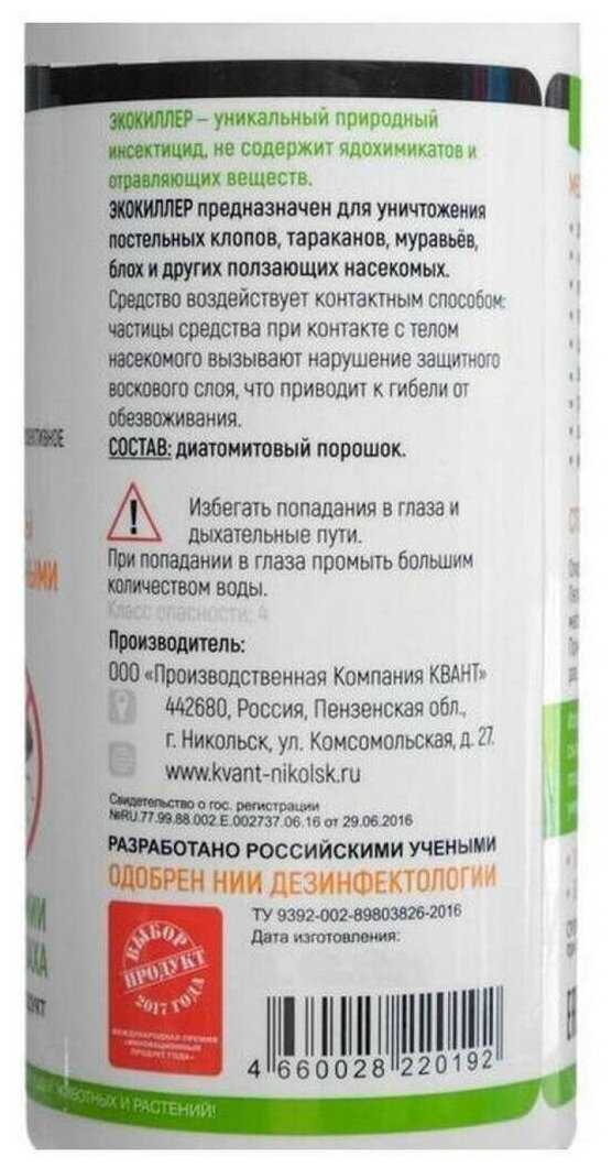 | Дополнительная информация : | ЭКОКИЛЛЕР полностью безопасен для человека и животных, нужно только следить за тем, чтобы во время использования случайно не вдохнуть порошок. |
