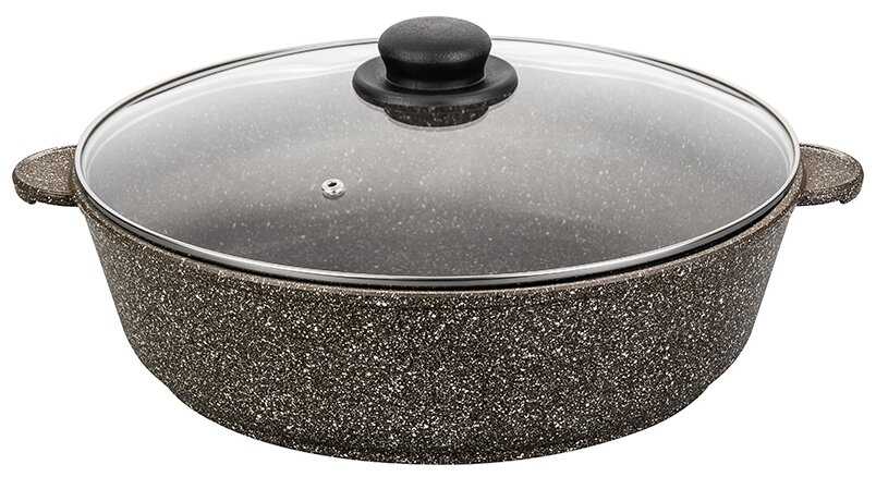 - + Большой объём, Прочное покрытие, Идёт со стеклянной крышкой, Ускоряет жарку и тушение раза в полтора