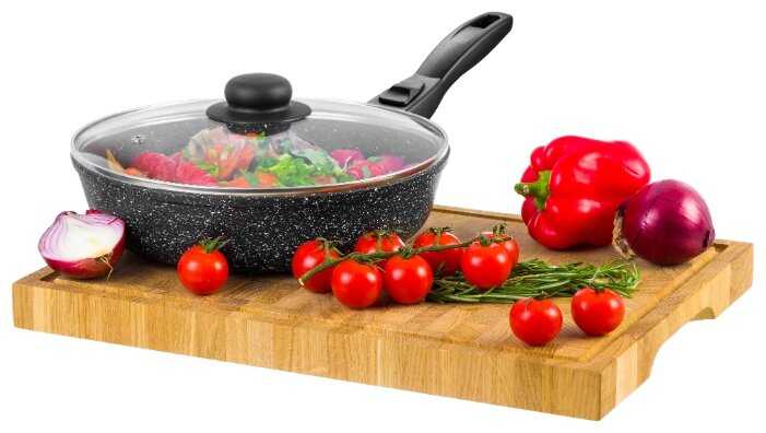 - + Высокие бортики, удобная съёмная ручка для хранения, крышка. Удобно и пожарить и потушить, как в сотейнике.