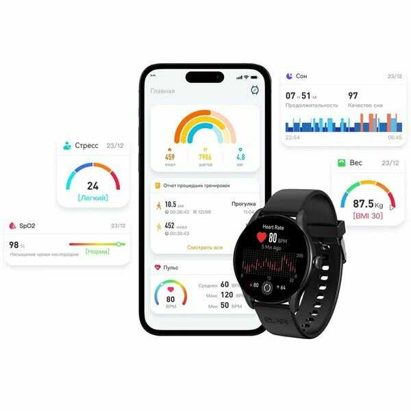 Мониторинг : | акселерометр, калорий, пульса, сна, термометр, тонометр, уровня кислорода в крови, уровня стресса, физической активности |