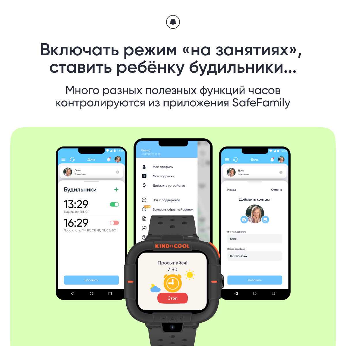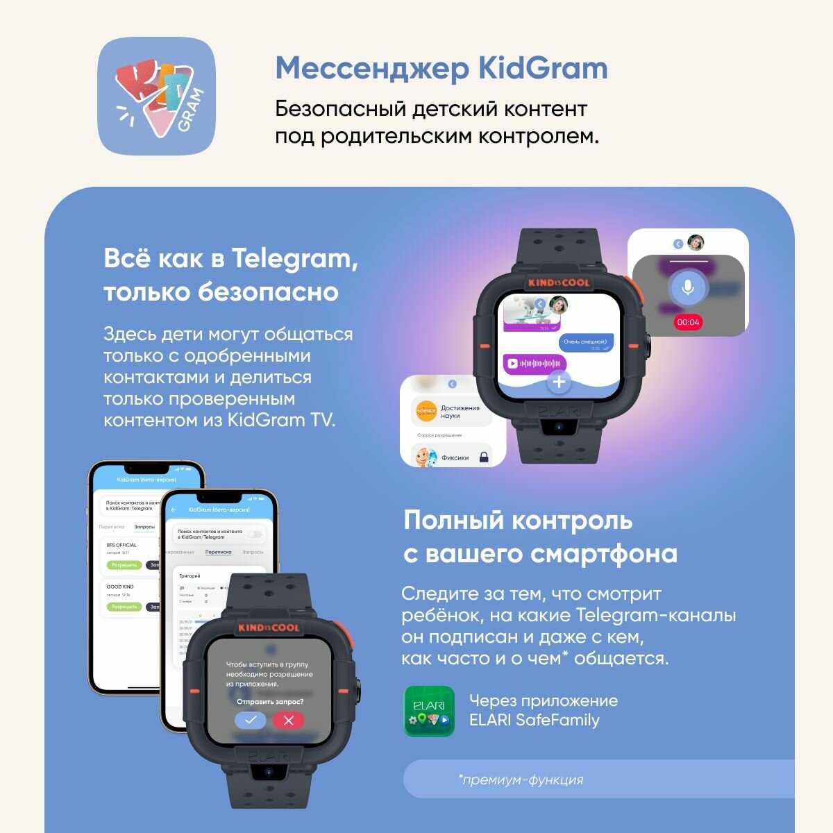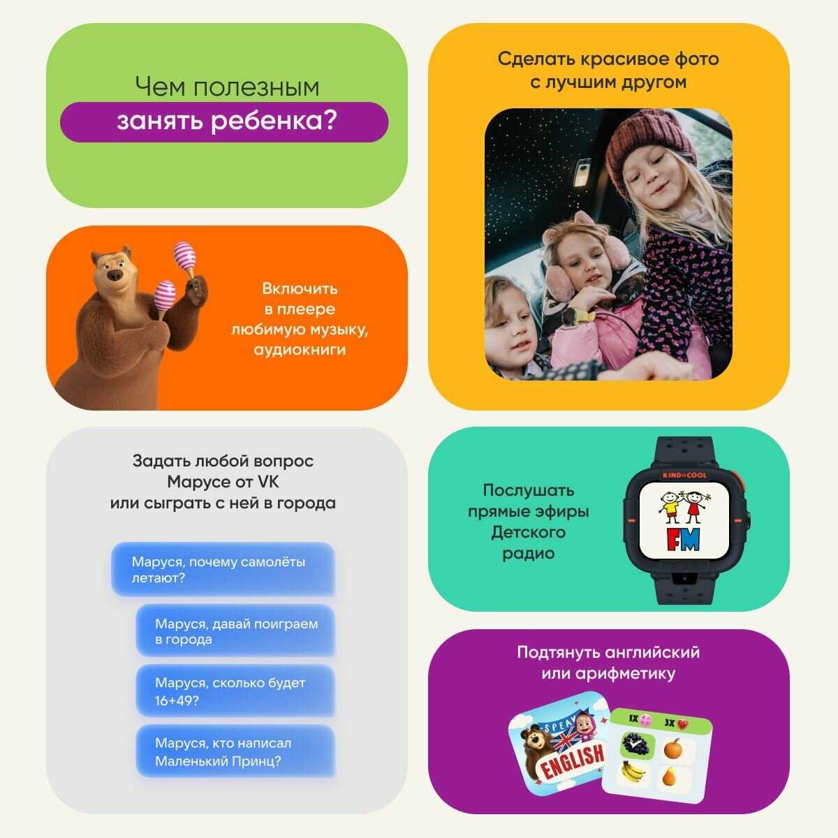 Дополнительная информация : | KidGram (детский шлюз в Telegram), режим «на занятиях», изменение рингтона и интерфейса экрана, виброрежим, игра «Английский с Машей и Медведем» |