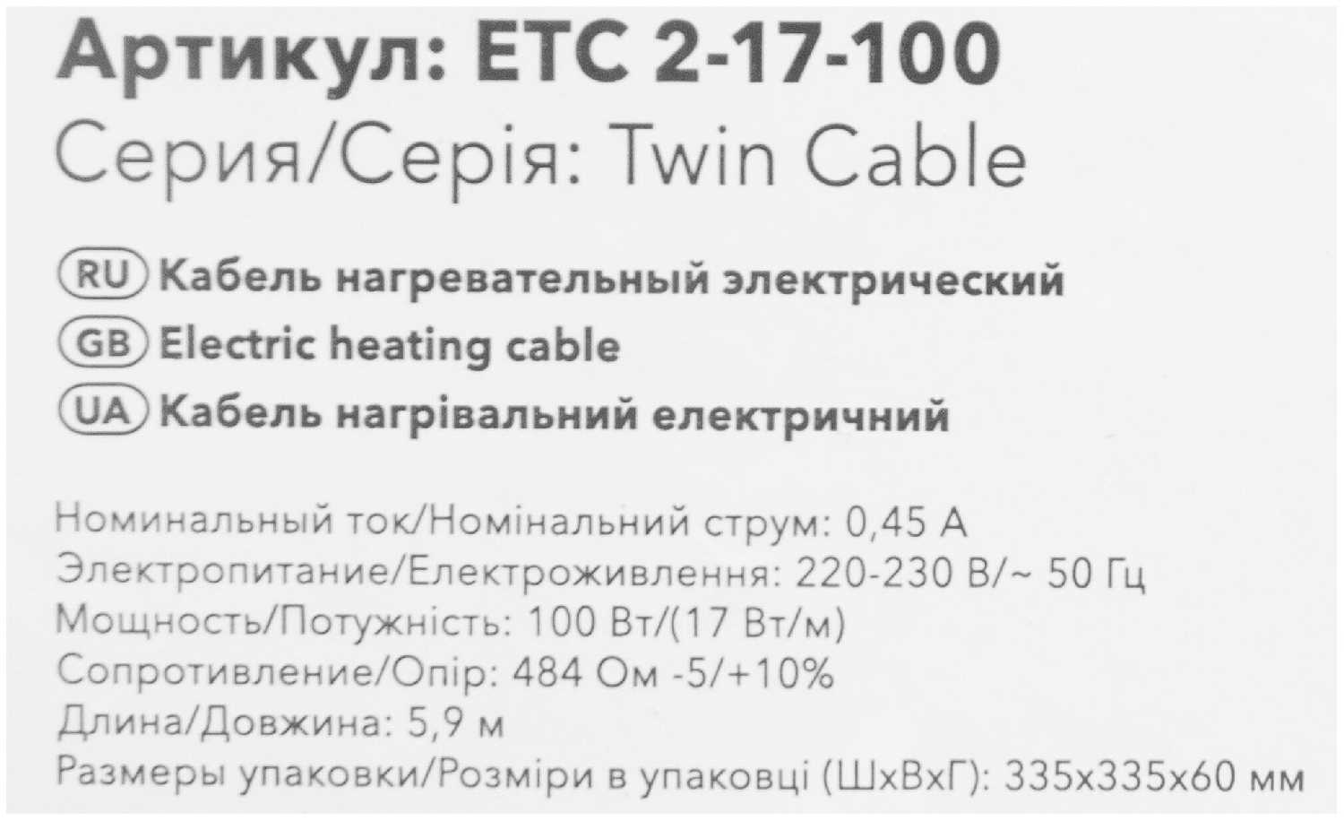 | Дополнительная информация : | Комплектация: Инструкция с гарантийным талоном, Вид напольного покрытия: Декоративное напольное покрытие, Монтаж: В стяжку, Сечение кабеля: 1 мм, Терморегулятор: Доп.опция, Длина соединительного кабеля питания: 2 м, Саморегуляция: Нет, Гарантийный документ: Гарантийный талон, Область применения: Для теплого пола, Тип нагревательного элемента: Нагревательный кабель, Класс пылевлагозащищенности: IP68, Вид установки (крепления): Внутрипольное, Серия: TWIN CABLE |