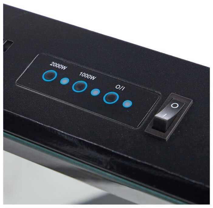 - Сенсорная панель на корпусе дублирует основные функции, включая отдельные кнопки для активации обогрева (2 режима мощности: 1 кВт и 2 кВт) и декоративного пламени.