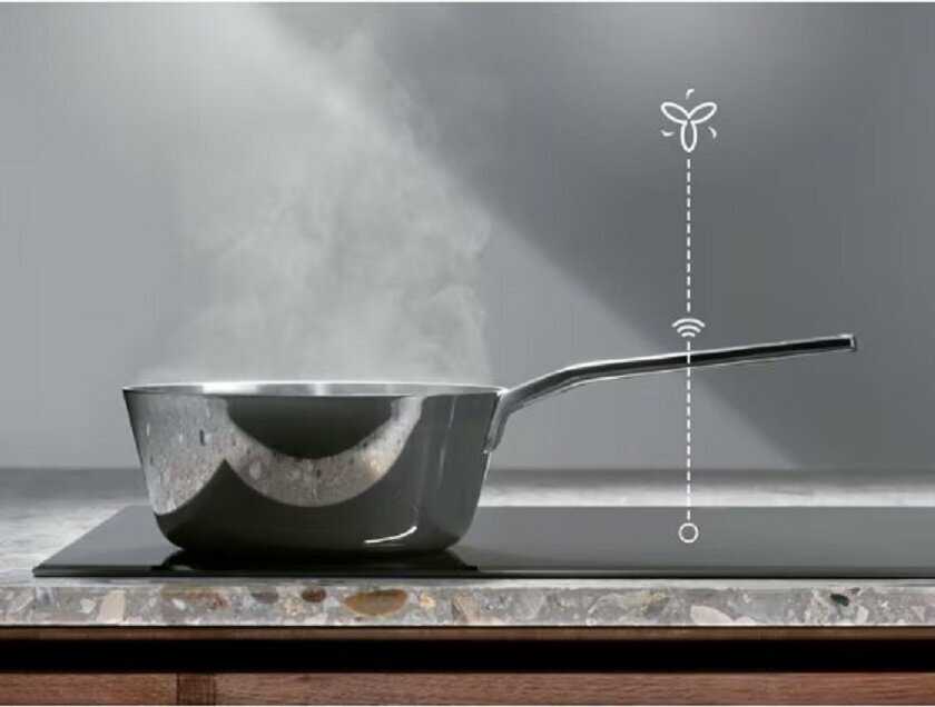 - Синхронизация с вытяжкой (Hob2Hood) автоматически включает вентиляцию и подсветку при старте готовки.