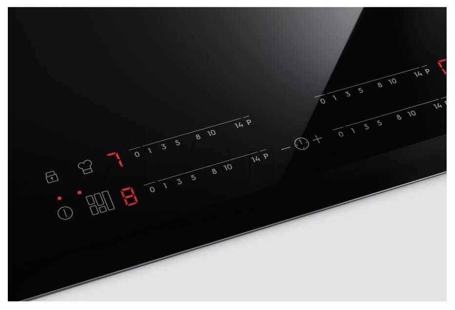 - Сенсорные слайдеры для каждой конфорки позволяют мгновенно выставлять мощность от 1 до 14 одним движением, без необходимости многократных нажатий.