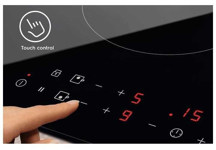 - Отзывчивый сенсор, быстро реагирует на сухие касания, не требует выбора конфорки заранее.