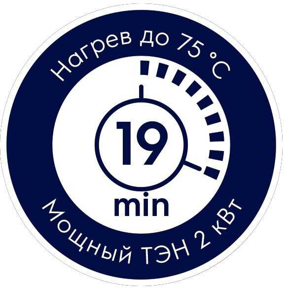 Нагрев полного бака занимает 15–30 минут в зависимости от режима: в ECO (55–60°C) — около 13–17 минут, на максимуме (75°C) — 23–29 минут. Мощность ТЭНа 2,2–2,5 кВт обеспечивает ступенчатый нагрев (сначала 1 кВт, затем добавляется второй), что снижает нагрузку на проводку. Пользователи подчёркивают, что даже после 8 часов простоя подогрев для поддержания температуры занимает всего 3–5 минут благодаря эффективной теплоизоляции. -