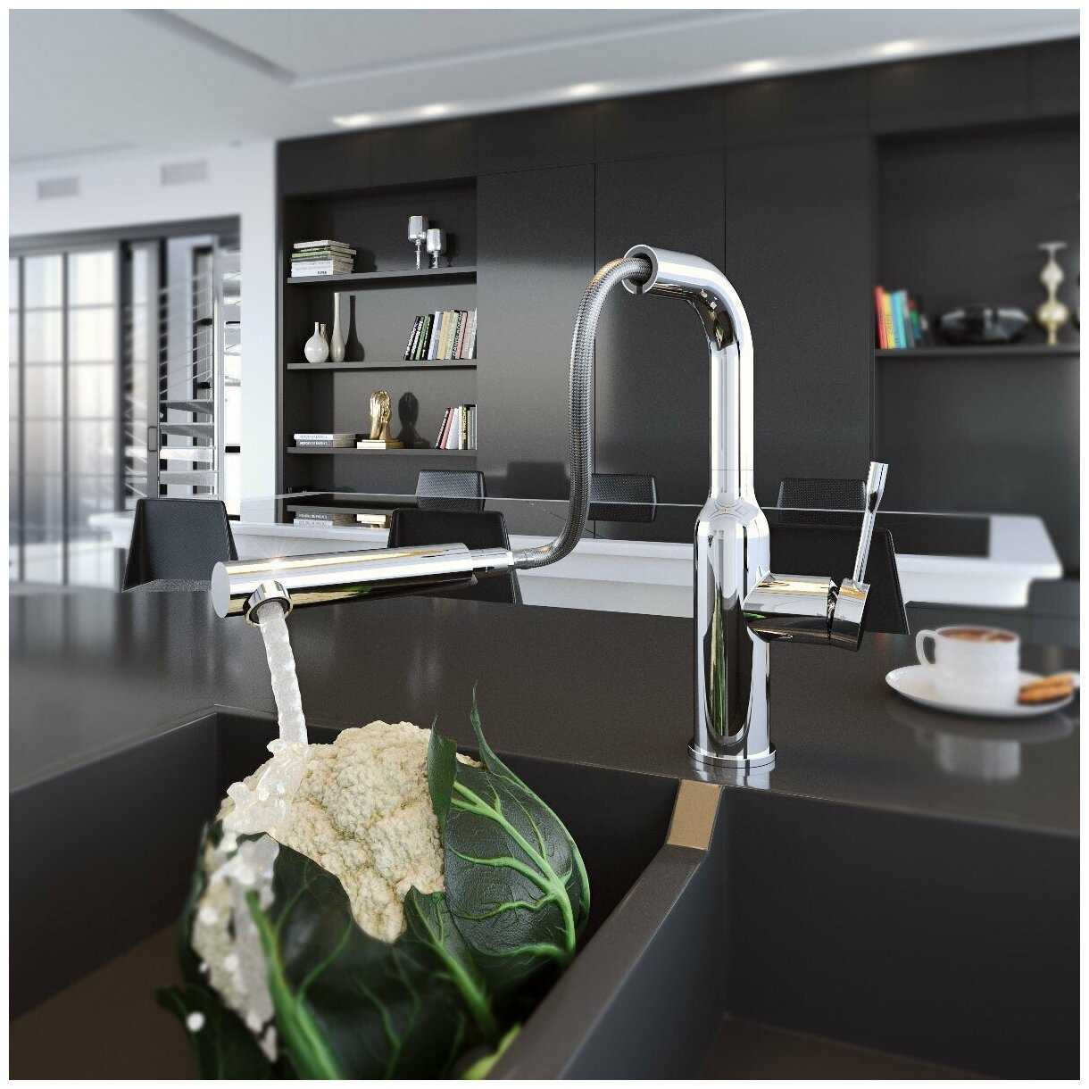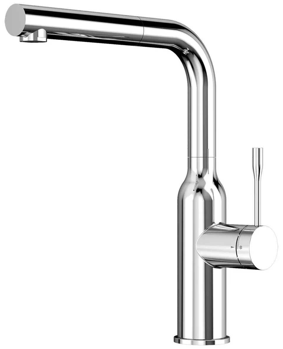 - + Качественное исполнение, оригинальный механизм возврата выдвижной лейки, эстетично смотрится в интерьере кухни.