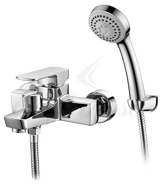 | @Комплектация : | Смеситель с керамическим переключателем, лейка пластиковая душевая, настенный кронштейн, металлический душевой шланг 150 см, эксцентрики, набор декоративных колпаков |