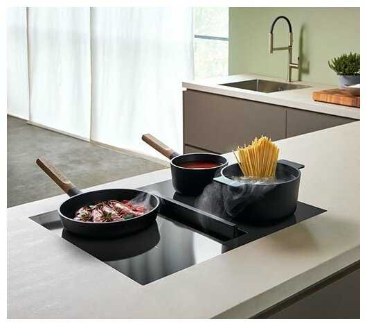 - + Удобно для острова на кухне, так как есть встроенная вытяжка.