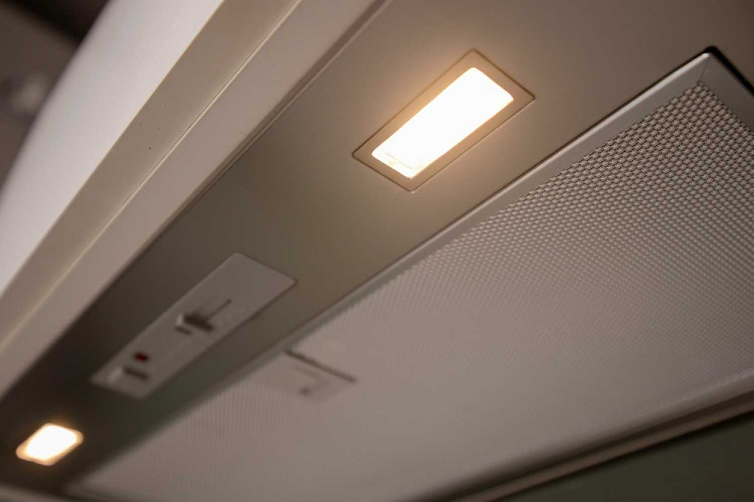 - Светодиодные лампы (в актуальных версиях) дают равномерный мягкий свет, освещая варочную поверхность и частично столешницу.