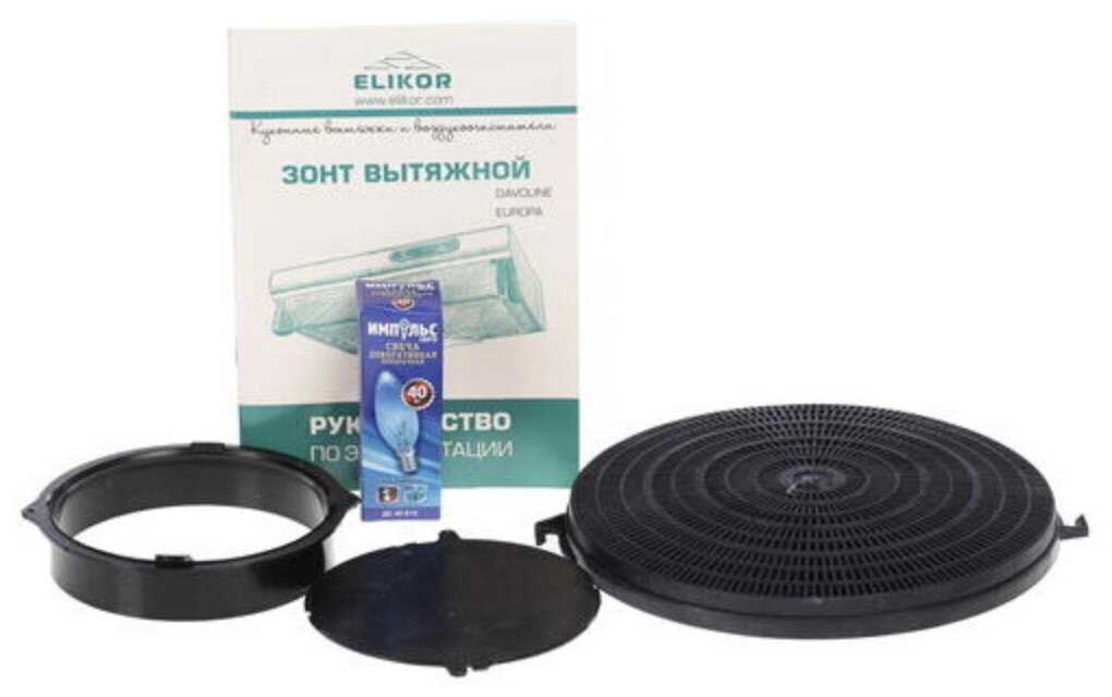 Стандартная комплектация включает жировой фильтр (металлический или акриловый — уточняйте при заказе), угольный фильтр для рециркуляции и лампу накаливания. Крепежные болты, заглушка для переключения между режимами отвода (вверх/в стену) и обратный клапан отсутствуют — их покупают отдельно. -