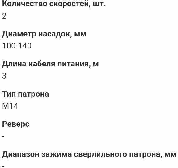 | Дополнительная информация : | обороты холостого хода на 1-й скорости: 0-570 об/мин на 2-й скорости: 0-750 об/мин, тип патрона: М14, диаметр смесительной насадки - 140 мм |