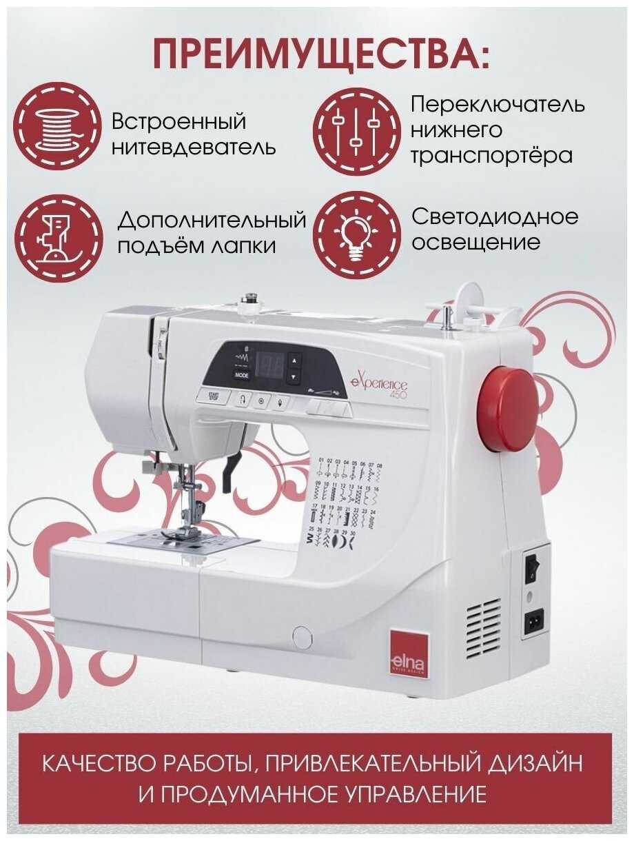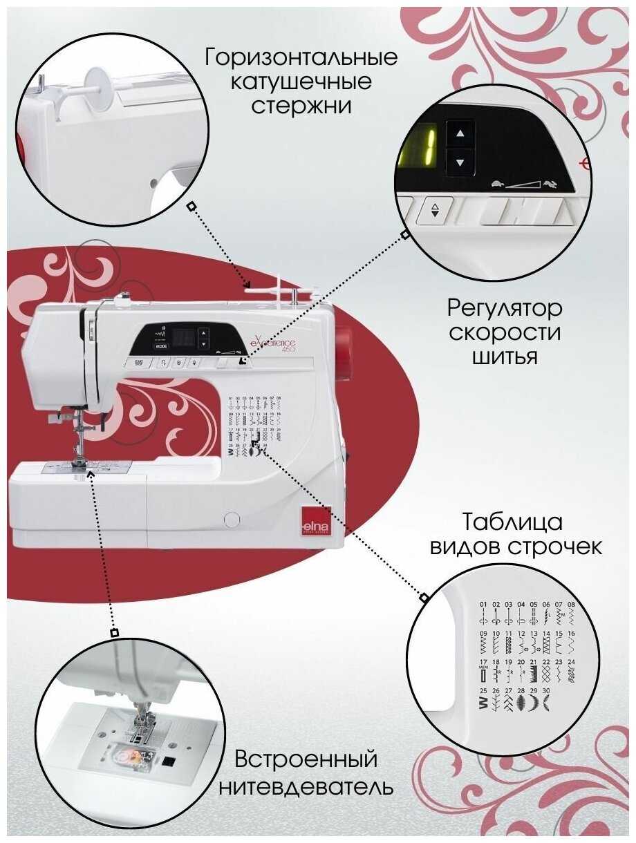 - + полуавтомат нитевдеватель; нормальное освещение; берет все типы тканей; регулировка скорости шитья; подробная инструкция
