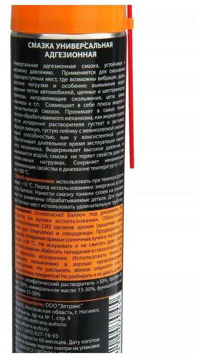 Способ применения : | Использовать при температуре не ниже +10 0С. Перед использованием энергично встряхнуть баллон. Нанести смазку тонким слоем на очищенные от ржавчины обрабатываемые детали. Для труднодоступных мест использовать удлинительную трубочку. Важно помнить, что при работе со смазками необходимо соблюдать правила безопасности. |