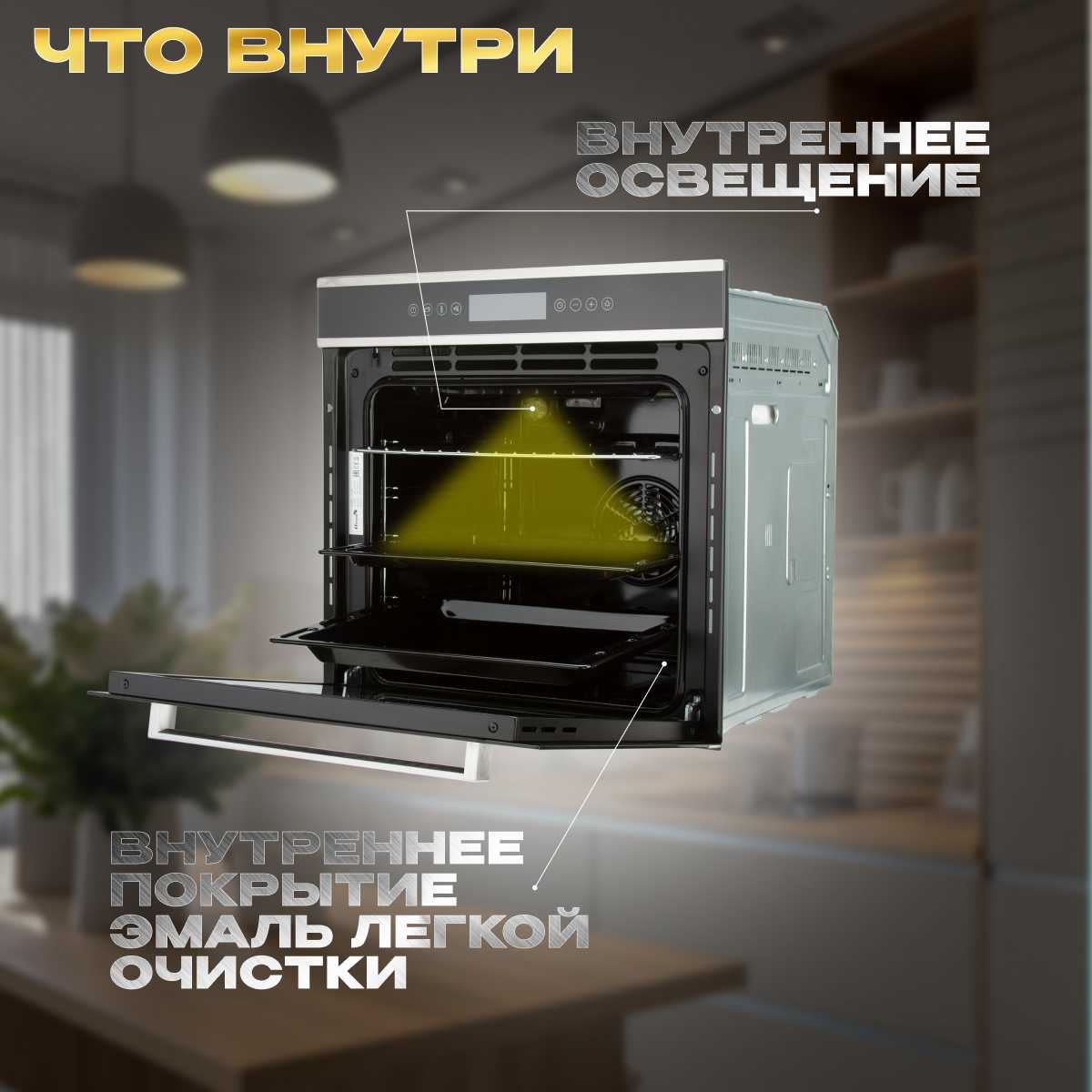 - + Полная блокировка кнопок от детей, не горячая дверь, выдувает воздух, только из отверстия чуть выше ручке, воздух идет от туда теплый, на кухне 6 кВ. М не сжигает воздух, как газовая духовка, находится на кухне можно, не душно и вкусно пахнет, отличная духовка для тех у кого есть дети