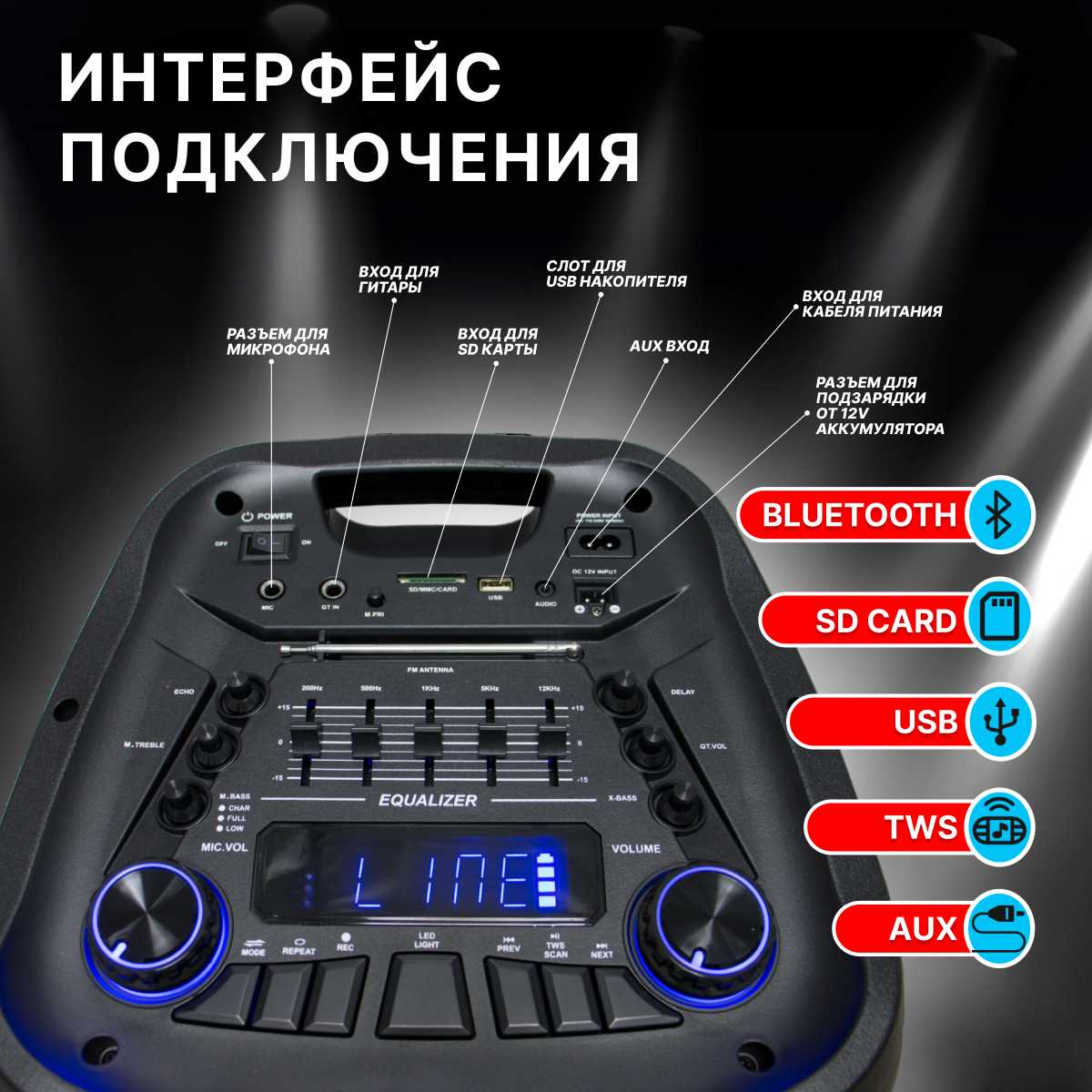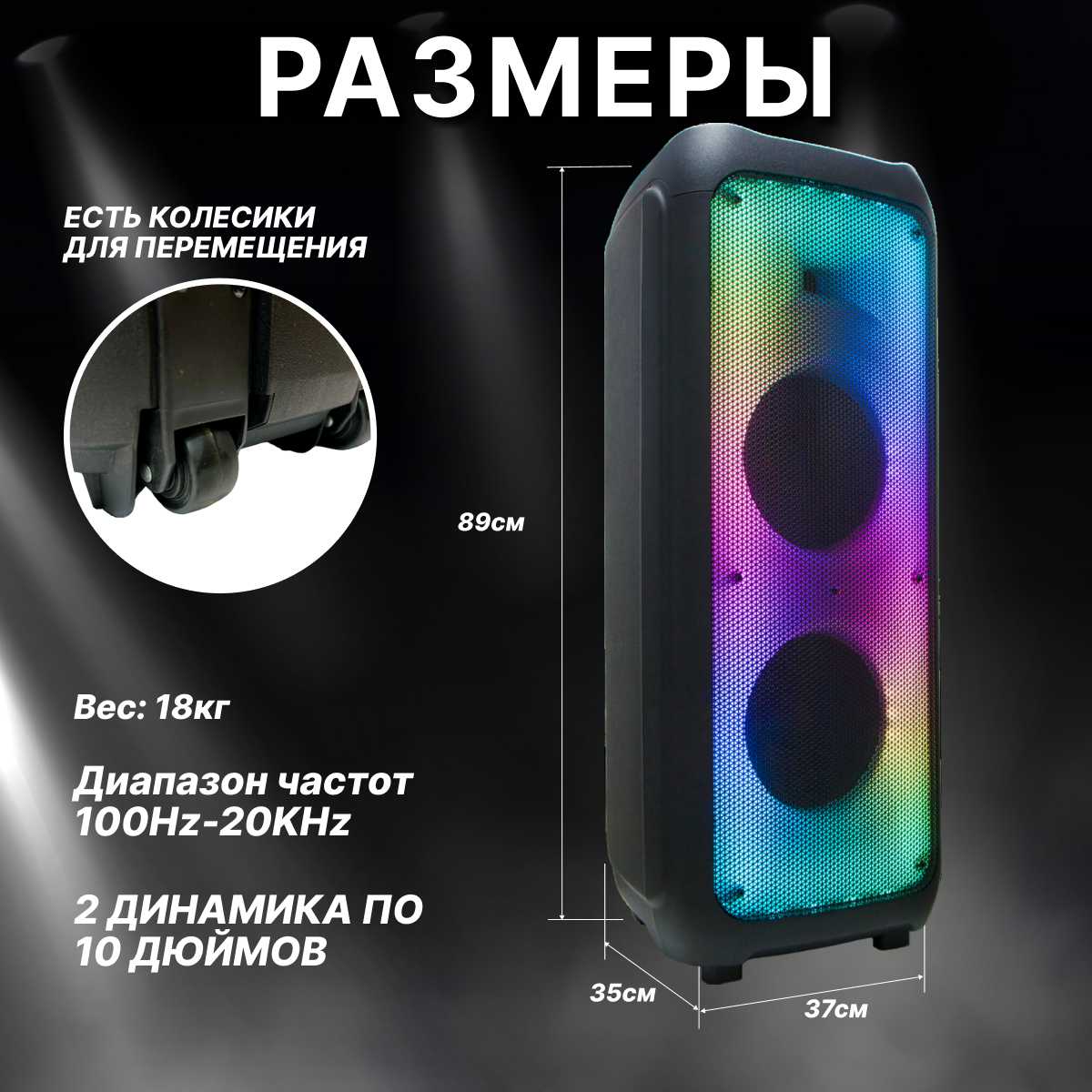 - + Классная большая, громкая колонка, чистота звука, эквалайзер( круто настроить звучание под звук или по соим предпочтениям). В комплекте 2 микрофона, пульт, батарейки, инструкция( правда не очень обширная), зарядное устройство. Так же возможность записи звука и подключение эл инструментов. Так же есть ручка и колесики для передвижения.