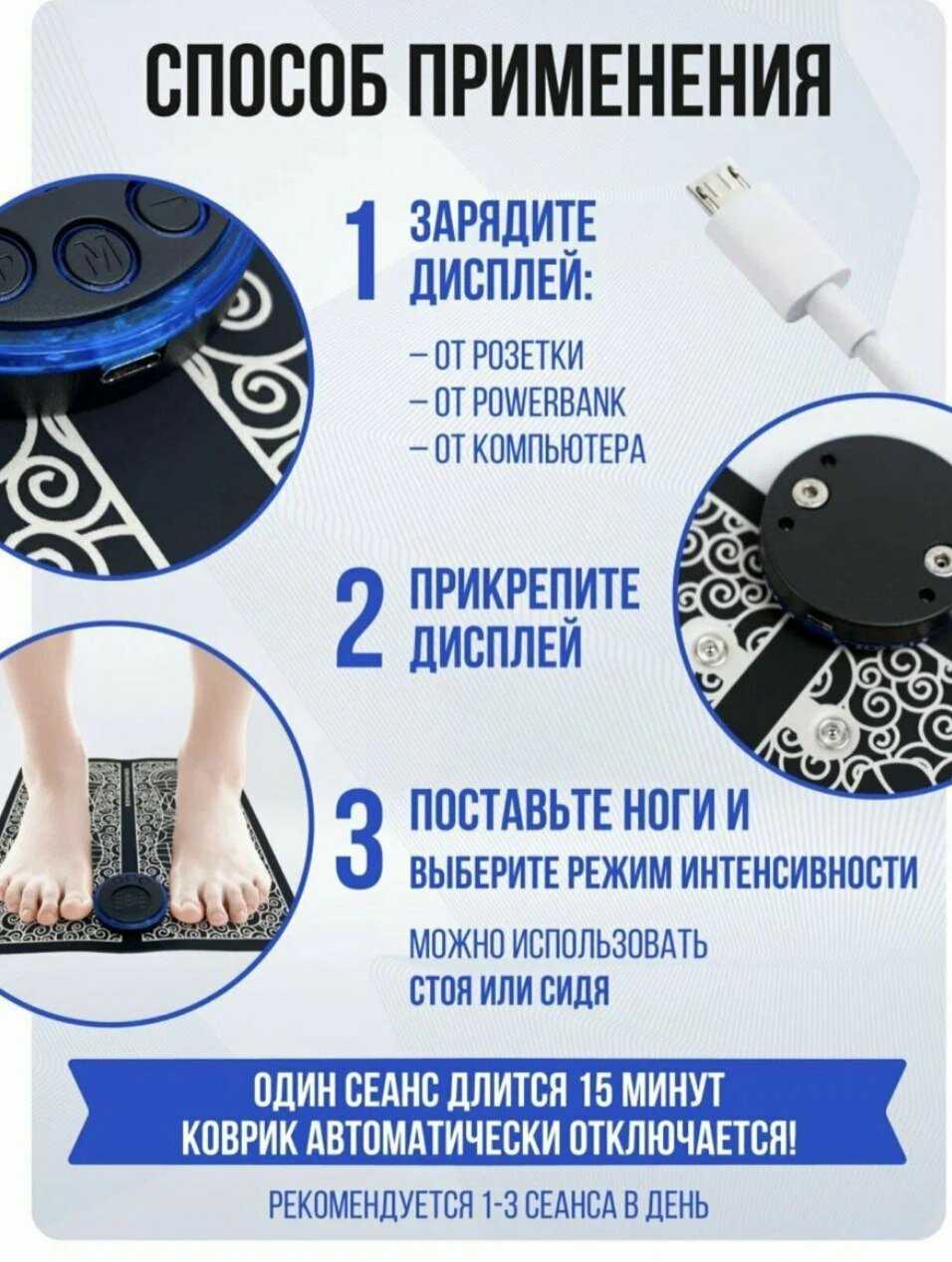Конструкция и удобство использования: Коврик оценивается как компактный и портативный ("можно с собой взять в командировку"), легкий ("Лёгкий и пластичный"). Однако его размер является недостатком для многих пользователей – ноги не помещаются комфортно, их трудно удержать вместе на контактных площадках ("трудно держать ноги вместе, немного бы коврик по-больше"). Работа от батареек (предположительно, тип АА) считается удобным решением для портативности ("удобные батарейки"). Процедура требует неподвижного сидения с установленными на коврик босыми ногами, иногда для лучшего контакта рекомендуют смачивать стопы или использовать гель ("если смочить коврик, то массажёр работает", "ноги смазываю гелем-бальзамом").