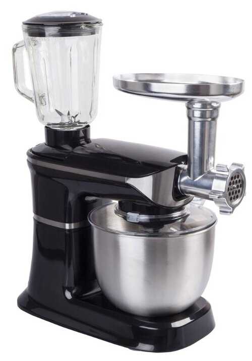 Решил купить это универсальный кухонный процессор жене на 30 лет совместной жизни - юбилей все-таки. Она задолго просила подарить ей к этой дате планетарный миксер и мясорубку. До сих пор она пользовалась электромясорубкой и ручным электромиксером, купленными еще во времена нашей молодости. Кстати, до сих пор еще кое-как работают - оказывается не все так было плохо в советское время:) Подсчитав что к чему, решил, что будет выгоднее купить именно этот комбайн, плюс для жены будет приятный сюрприз, что она получит еще и совсем немаленький блендер. Как инженер-механик, оценил, что номинальная мощность двигателя, которая составляет 1,3 кВт, должна с запасом обеспечить нормальное функционирование всех 3-х устройств. Управление всеми устройствами построено полностью на механике - на рычажках и поворотном переключателе. Для оптимальной работы каждого из этих устройств, с помощь поворотного переключателя, предусмотрен выбор из 6 скоростей вращения. Есть и 7-й режим - пульсирующий, предназначен для раскалывания льда в блендере. Понравилось, что в мясорубке, в составе шнековой группы, на шнеке, перед ножом, установлена силиконовая муфта, которая, в случае аварийного превышения нагрузки на вал электродвигателя, раскалывается, тем самым снимается нагрузка с вала, и защищается дорогой электродвигатель от сгорания. Другими словами, эта силиконовая муфта играет роль как бы дешевого плавкого предохранителя, хорошо всем известного, защищающего гораздо более дорогую деталь от повреждения. Также продуманны и все остальные конструктивные решения. Например. Присоединительный разъем блендера закрыт предохранительной крышкой и имеет блокировку верхней консоли. Присоединительный разъем мясорубки также закрыт защитной крышкой. Такие защитные меры связаны с тем, что раздача мощности происходит одновременно на все механизмы, т.е. вращаются сразу три присоединительных вала. Поэтому, чтобы избежать возможных травм, при использовании любого устройства, остальные два разъема должны быть прикрыты защитными крышками. Все операции подробно и понятно изложены в хорошо иллюстрированной схемами и рисунками инструкции пользователя. Таким образом, в состав этого кухонного процессора входит планетарный миксер с чашей объемом 6,5 л, блендер с рабочим сосудом объемом 1,5 л и достаточно производительная мясорубка. Причем, как это предусмотрено и в обычных миксерах и блендерах, в их основных крышках есть отверстия, закрываемые малыми крышками, и через эти отверстия, не останавливая ход работы, можно доливать/докладывать/подсыпать нужные ингредиенты. По прошествии более 2-х месяцев с момента покупки этого процессора, слышу от своей жены только восторженные характеристики и слова благодарности. Она очень довольна моим подарком, а это значит, что пользоваться им просто и удобно, и все свои функции выполняются на должном уровне. Как итог, рекомендую - это универсальный качественный процессор по вполне выгодной цене.