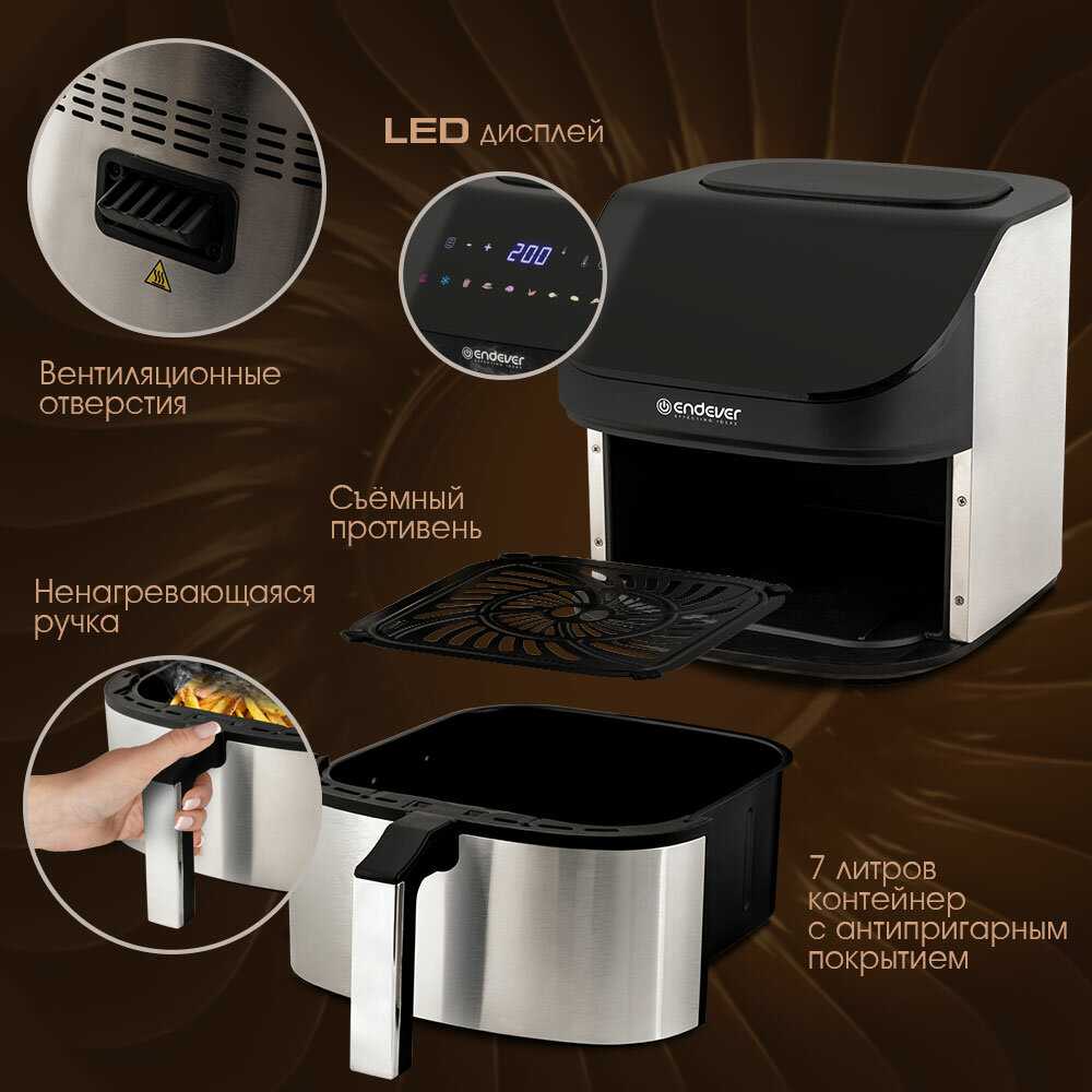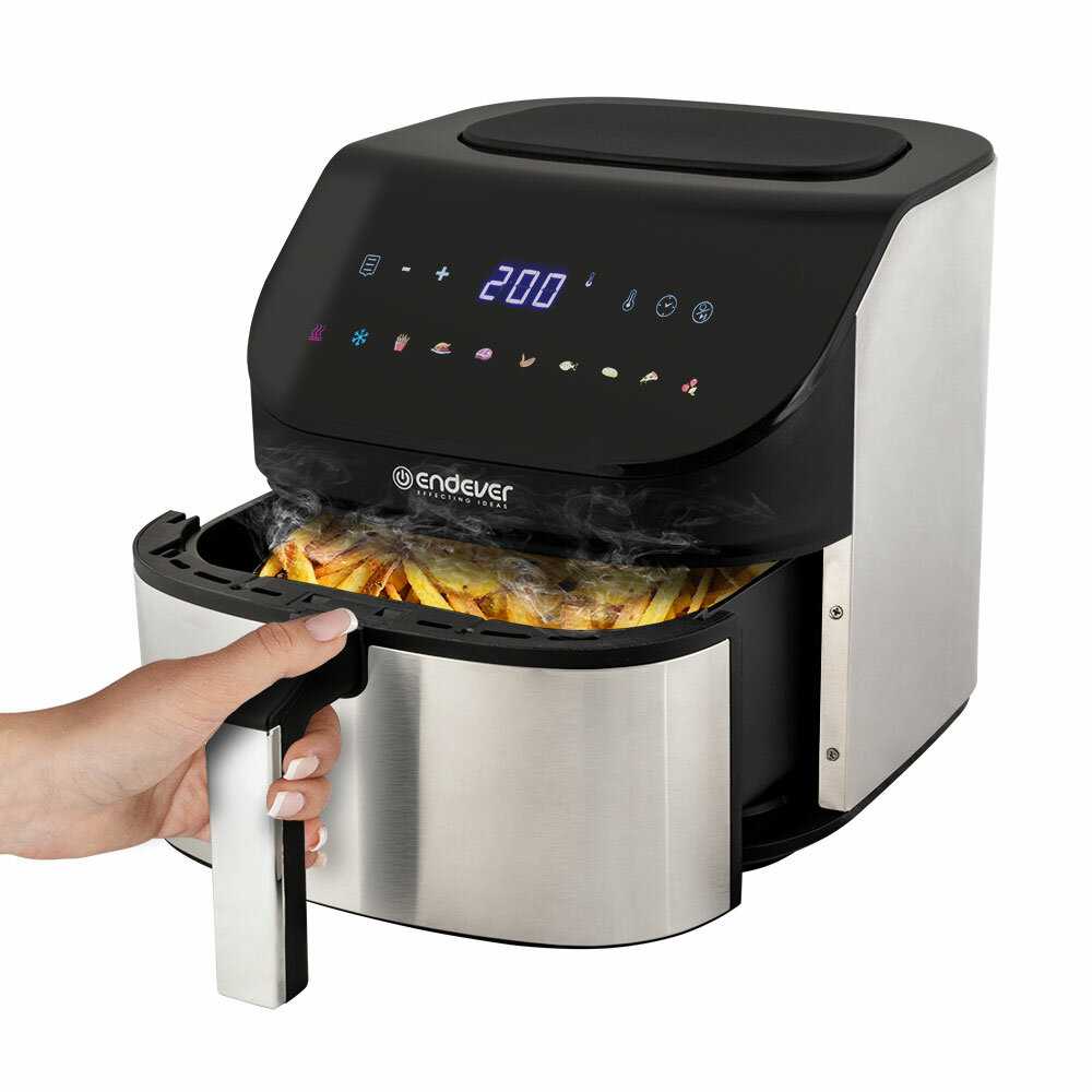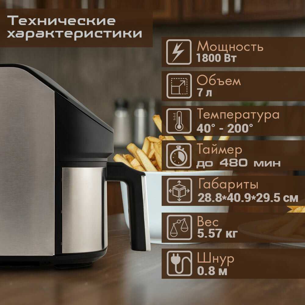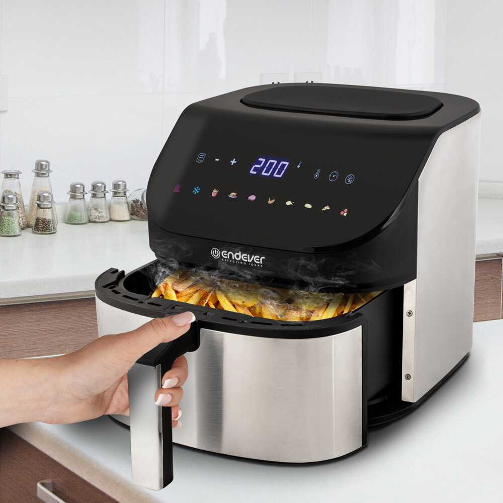 Крылышки и голени курицы готовятся за 20–40 минут при 180 градусах, получаясь сочными внутри с хрустящей корочкой. Замороженные стейки из форели пропекаются за 20 минут. Ребрышки и картошка тоже выходят быстро и вкусно. Время короче, чем в духовке или на сковороде, что экономит энергию. -