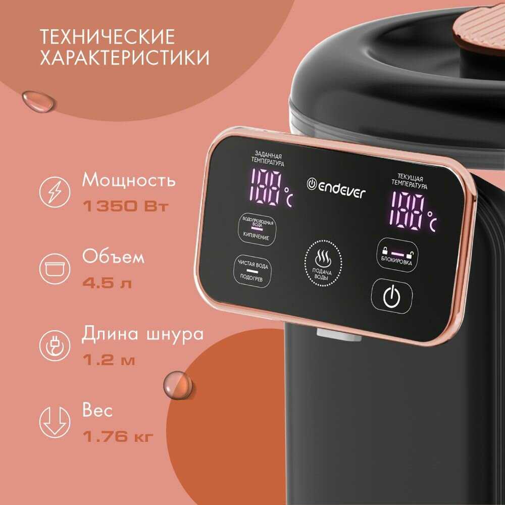 Термопот отличный. Самое главное, что меня в нём привлекло, это правильное расположение табло. Есть с чем сравнить.ENDEVER привлек меня именно своим дизайном. В нем все правильно. Табло сверху, пар до него не доходит. Значит прослужит долго. Нет лишних звуков- пищалок, которые так раздражают по утрам. Кипяток налил, еле слышно пикнул два раза и тишина. Ну и конечно очень порадовало, что его легко мыть. Съемный резервуар это просто отлично! Объем 4 литра хватает более чем. Вообщем я в полном восторге. В нем все для меня идеально. Доставка была вовремя, товар без повреждений и брака. Спасибо огромное.
