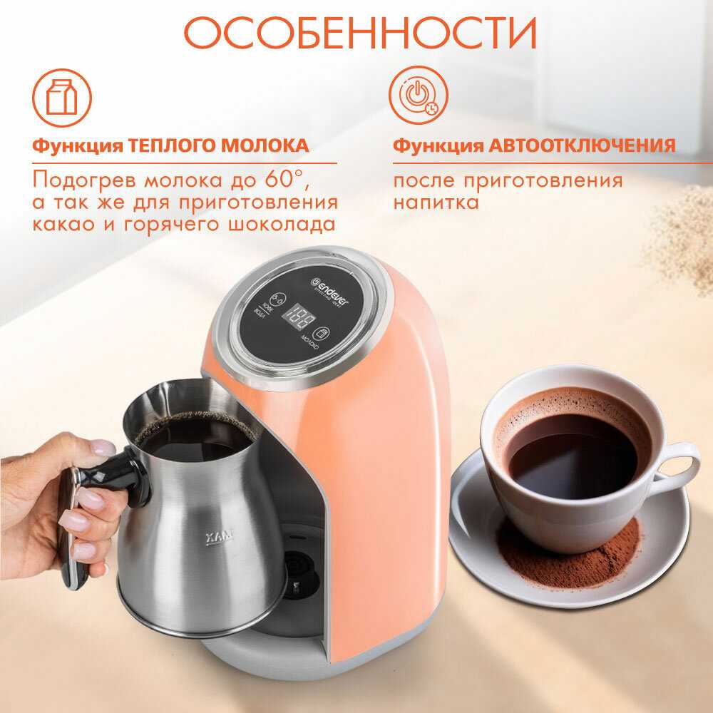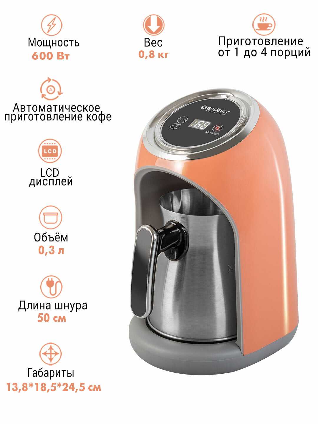 - + Кофеварку получила, опробовала. Варит вкусный кофе, с пенкой. Минуты 2-3 на максимальном кол-ве воды. Получается 4 турецких чашечки. Оказывается в ней еще можно варить какао и горячий шоколад на молоке, отдельная кнопка для этого, греет молоко до 60 градусов. Очень нравится, что сама турка из нержавейки, нет запаха пластмассы. Кофе использовала молотый Мехмет эфенди.
