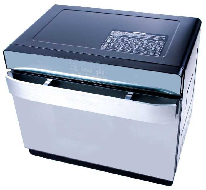 - Съемная дверца с двойным стеклом и демонтируемые нагревательные элементы (верхний ТЭН, поддон для конденсата) упрощают чистку.