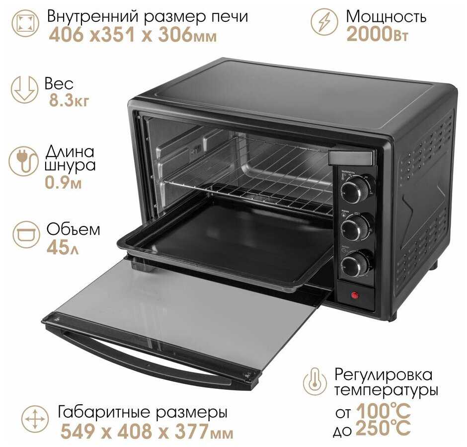 Внутренний объем позволяет готовить для семьи из 3-4 человек: одновременно помещается целая курица-гриль или крупный пирог. Габариты компактнее стандартной духовки, но больше микроволновки. Для 1-2 человек размер оптимален, особенно при установке на кронштейны. -