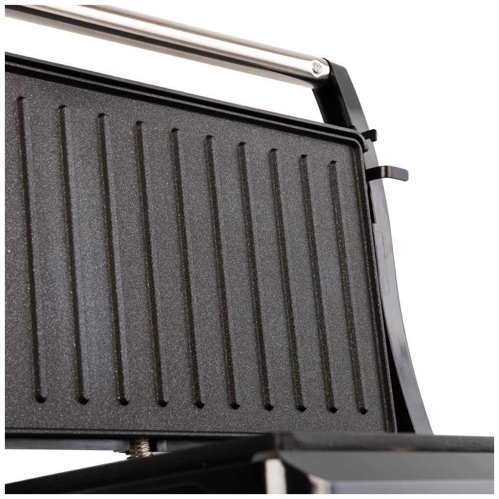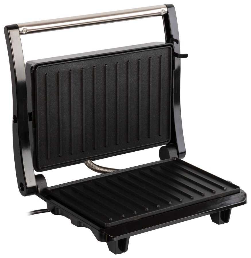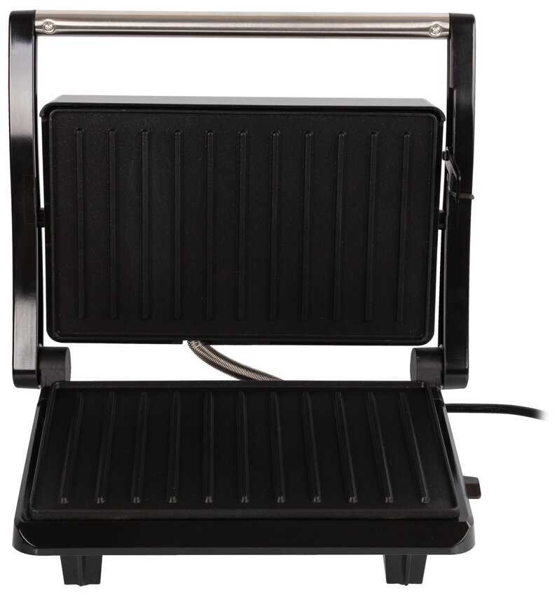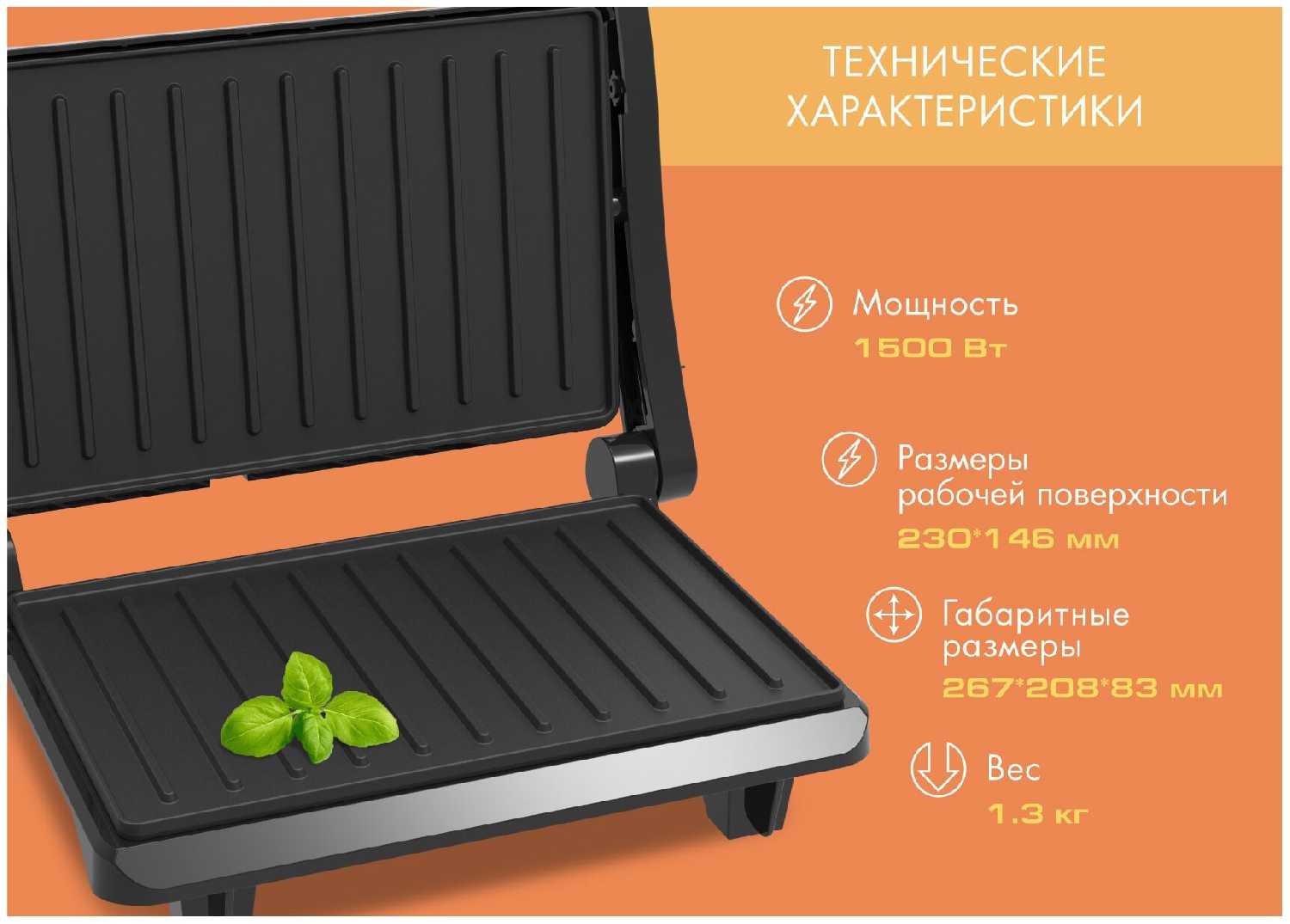 - Равномерный нагрев позволяет готовить стейки уровня medium, овощи и бутерброды без подгорания.