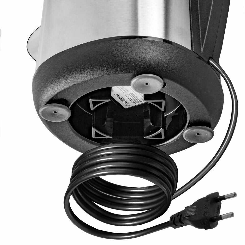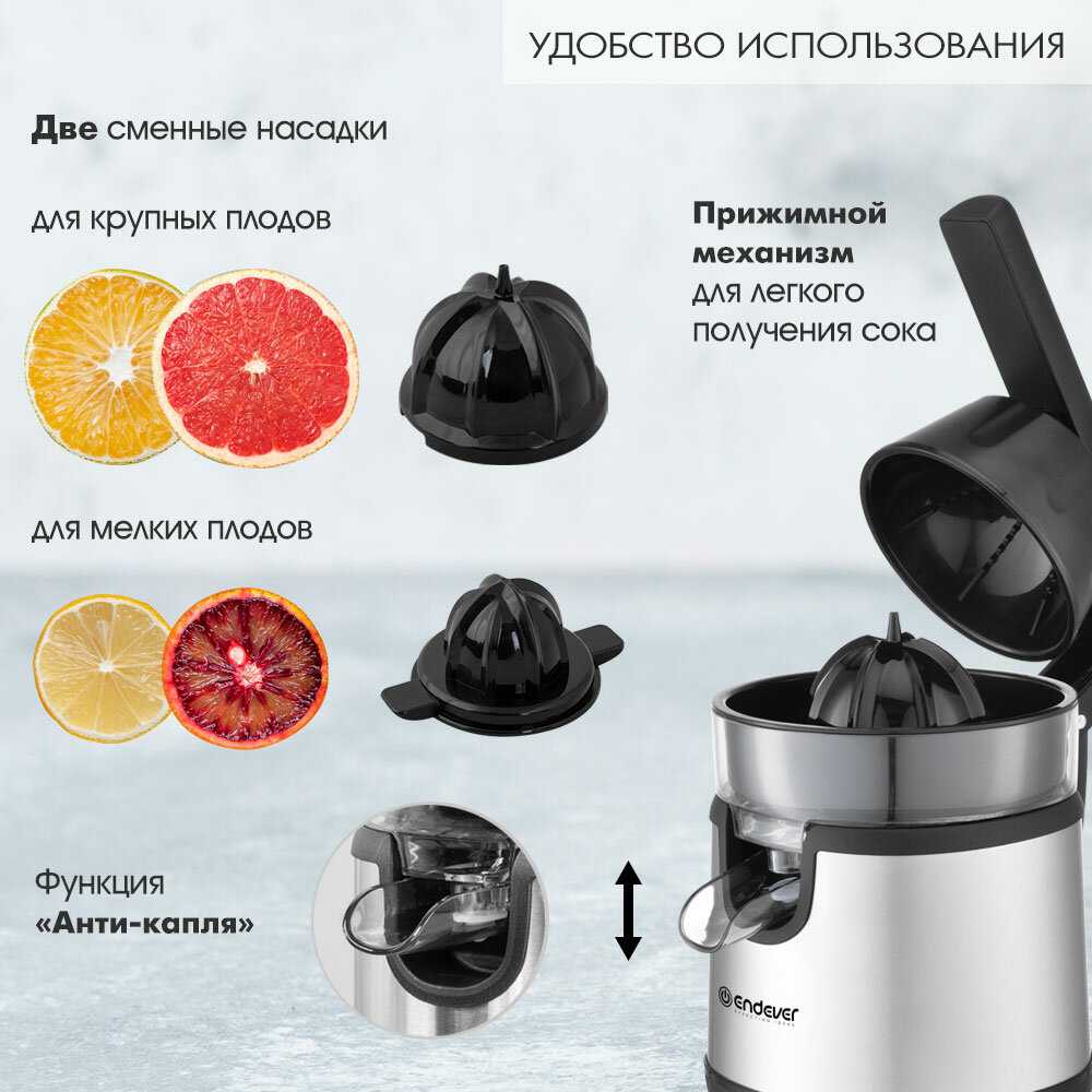 - Отжимает большие апельсины за 45 секунд, справляется с грейпфрутами без прижимной ручки.