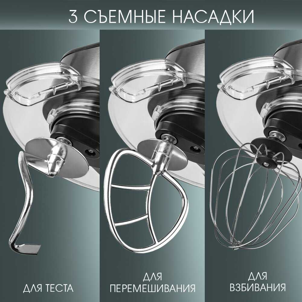 - + Этот миксер меня правда порадовал своей мощностью, она на высоте среди всех похожих бытовых моделей, которые я видел. Стабильно стоит на месте во время работы, не шатается никуда. Чаша глобукой формы просто супер - ни капли не разлетается, и тесто не вываливается. Работает довольно тихо, что приятно для кухни. Переключать скорости удобно, а сенсорный таймер добавляет удобства в использовании.
